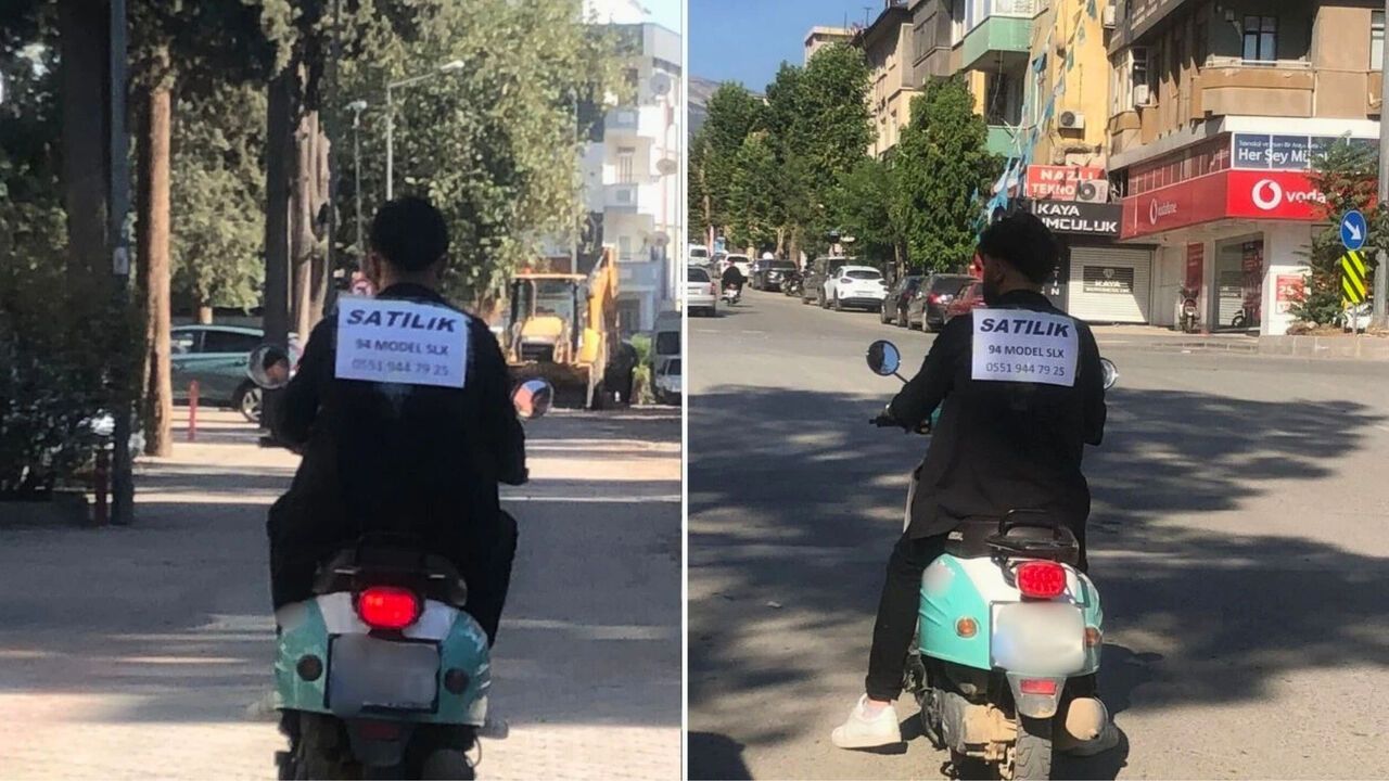 Aracını uzun süredir satamayan vatandaş, dikkat çekmek için alışılmışın dışında bir yol izledi. Sırtına, üzerinde “Satılık araç” yazan bir ilan kâğıdı yapıştıran vatandaş, gün boyu kentin farklı noktalarında dolaşarak aracını satmaya çalıştı.