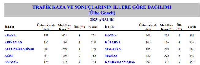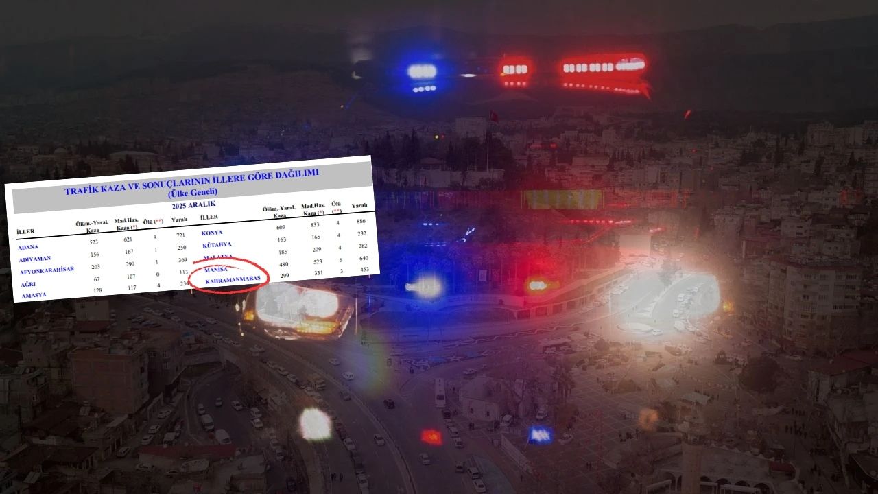 Emniyet Genel Müdürlüğü, 2025 Aralık ayına ait trafik kazası istatistiklerini yayımladı. Verilere göre sadece Aralık ayında Kahramanmaraş genelinde 299’u ölümlü ve yaralanmalı, 331’i maddi hasarlı olmak üzere toplam 630 trafik kazası meydana geldi. Bu kazalarda 3 kişi hayatını kaybetti, 453 kişi ise yaralandı.