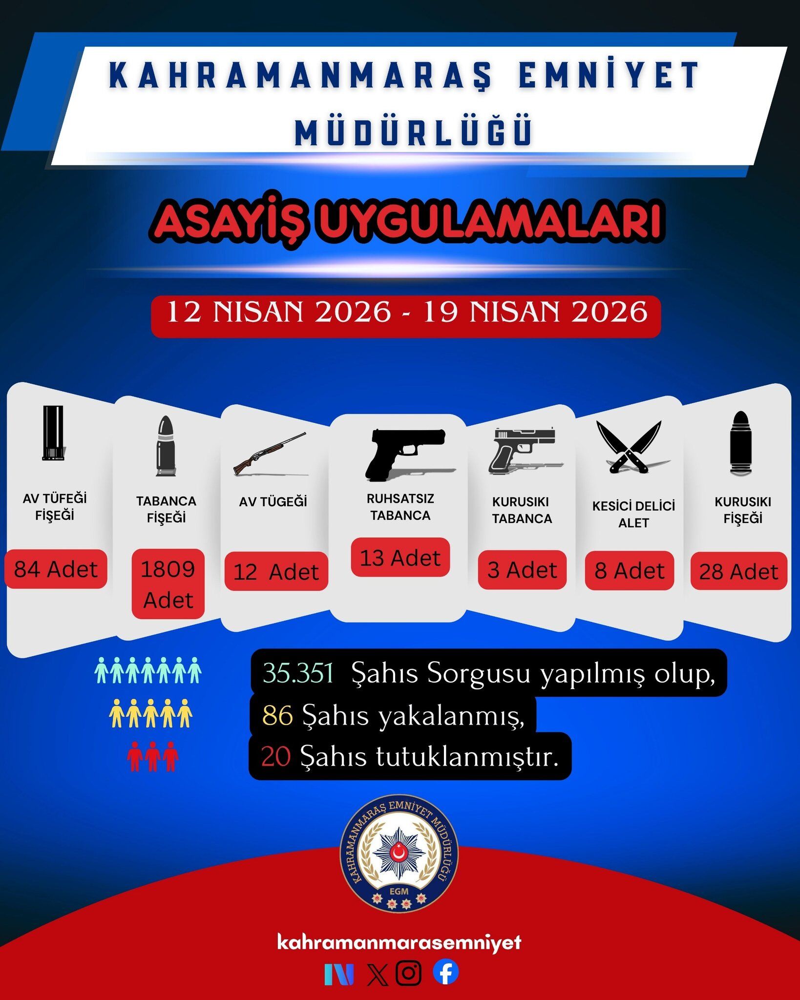 Kahramanmaraş İl Emniyet Müdürlüğü, suç ve suçluyla mücadele kapsamında yürüttüğü kararlı operasyonlarına bir yenisini daha ekledi. 12 Nisan ile 19 Nisan 2026 tarihleri arasını kapsayan bir haftalık asayiş uygulamaları raporu, emniyetin sahadaki gücünü ve titiz çalışmasını gözler önüne serdi. Yapılan resmi açıklamaya göre, belirtilen tarih aralığında kent genelinde tam 35.351 şahıs sorgusu gerçekleştirildi. Bu devasa denetim ağı sayesinde, aranan ve şüpheli görülen şahıslar tek tek tespit edilerek etkisiz hale getirildi. Operasyonlar neticesinde 86 şahıs yakalanarak emniyete götürülürken, işlemlerinin ardından hakim karşısına çıkarılan 20 şahıs tutuklanarak cezaevine gönderildi. Emniyet güçlerinin suç unsurlarına yönelik gerçekleştirdiği baskınlarda ise adeta bir cephanelik ele geçirildi. Ruhsatsız tabancalardan av tüfeklerine, binlerce mermiden kesici aletlere kadar çok sayıda materyal suçun önlenmesi adına muhafaza altına alındı. İşte Kahramanmaraş’ta huzuru tesis eden o dev operasyonun çarpıcı sayısal verileri ve tüm ayrıntıları…