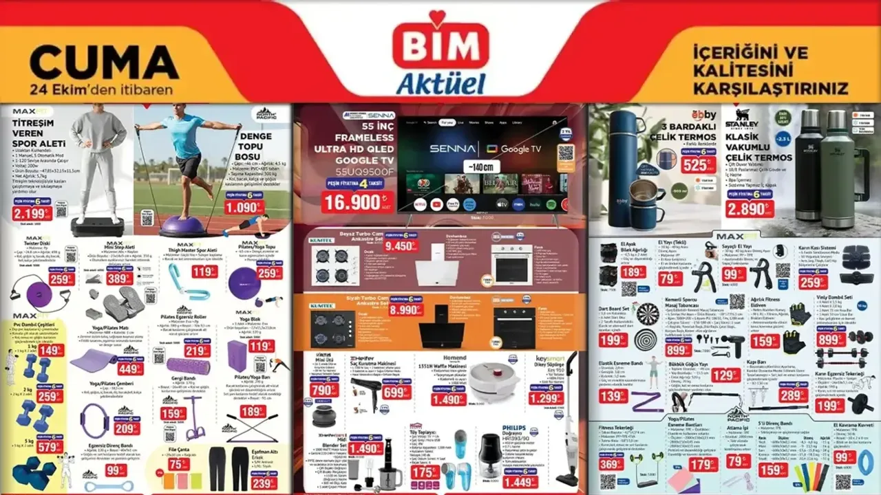 BİM, her hafta cuma günü müşterilerini sürpriz indirimlerle buluşturmaya devam ediyor. 24 Ekim 2025’te mağazalarda yer alacak aktüel ürünler listesi yayınlandı. Beyaz eşyadan spor malzemelerine, züccaciyeden terlik ve oyuncaklara kadar onlarca ürün, bu hafta raflarda yerini alacak.
