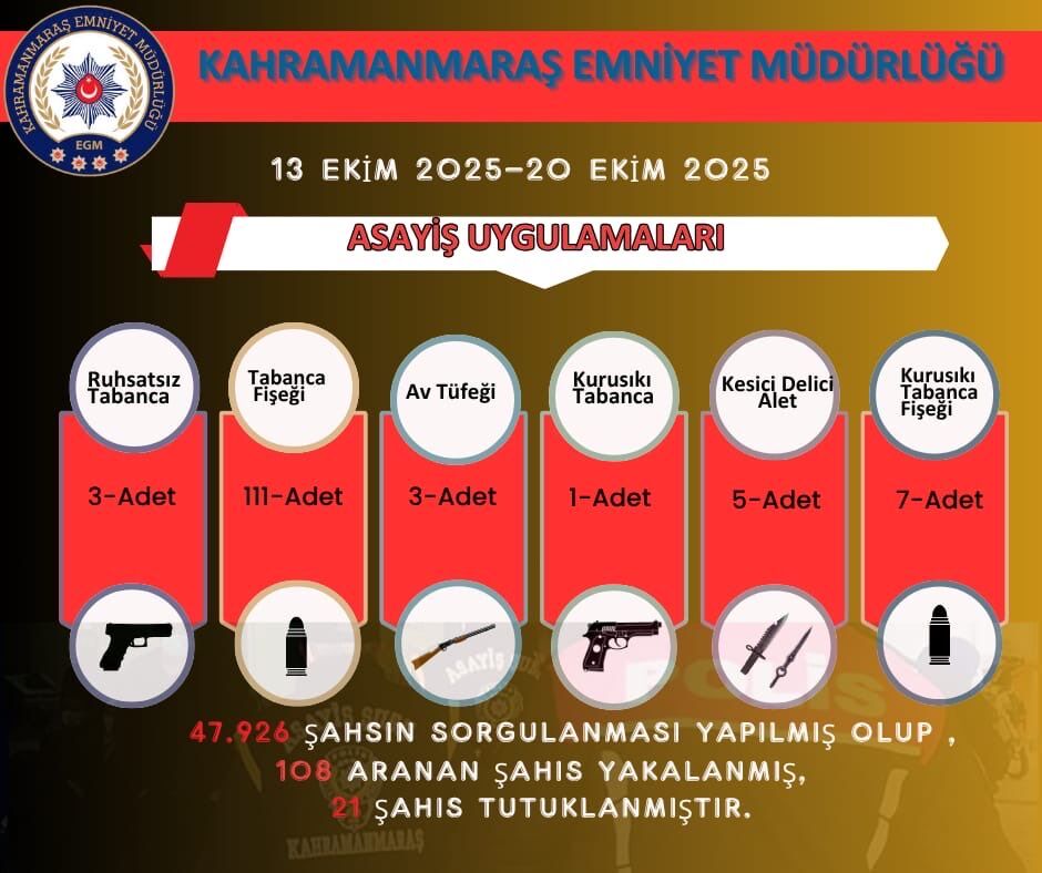Kahramanmaraş Emniyet Müdürlüğü, 13-20 Ekim 2025 tarihleri arasında kent genelinde kapsamlı asayiş uygulamaları gerçekleştirdi. Uygulamalar kapsamında toplam 47 bin 926 kişinin sorgulaması yapıldı. Yapılan sorgulamalarda çeşitli suçlardan arandığı belirlenen 108 kişi yakalandı. Yakalanan şahıslardan 21’i çıkarıldıkları mahkemece tutuklandı.