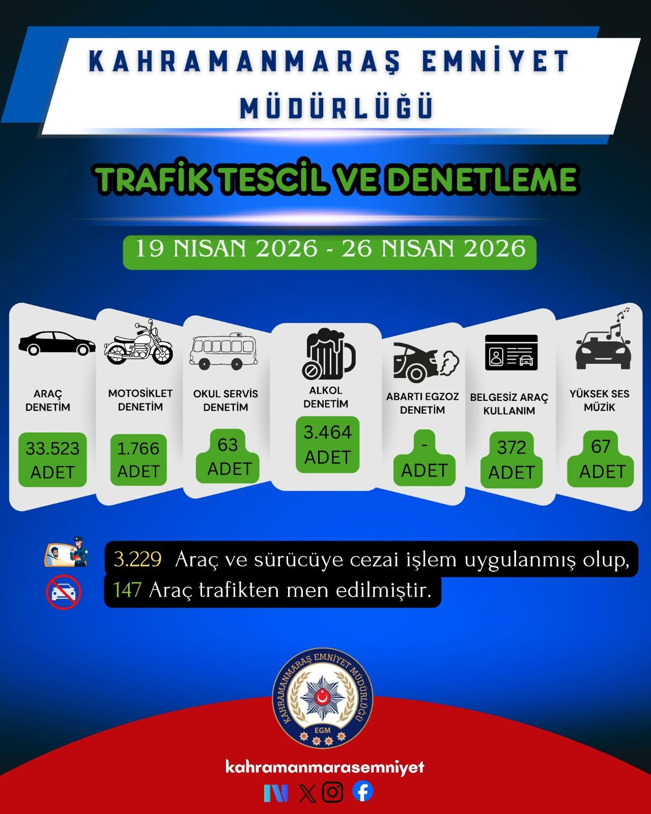 Kahramanmaraş İl Emniyet Müdürlüğü Trafik Tescil ve Denetleme Şube Müdürlüğü ekipleri, şehir genelinde trafik güvenliğini sağlamak ve kazaları en aza indirmek amacıyla yürüttüğü bir haftalık yoğun denetim programının sonuçlarını paylaştı. 19 Nisan – 26 Nisan 2026 tarihleri arasında gerçekleştirilen uygulamalarda, 33 binden fazla araç titizlikle incelenirken; kural ihlali yapan sürücülere göz açtırılmadı. Alkol denetimlerinden okul servislerine, belgesiz araç kullanımından yüksek sesle müzik yayınına kadar pek çok alanda yapılan kontroller sonucunda 3.229 araç ve sürücüye cezai işlem uygulandı. Denetimler kapsamında 147 araç ise trafikten men edilerek güvenli alanlara çekildi.