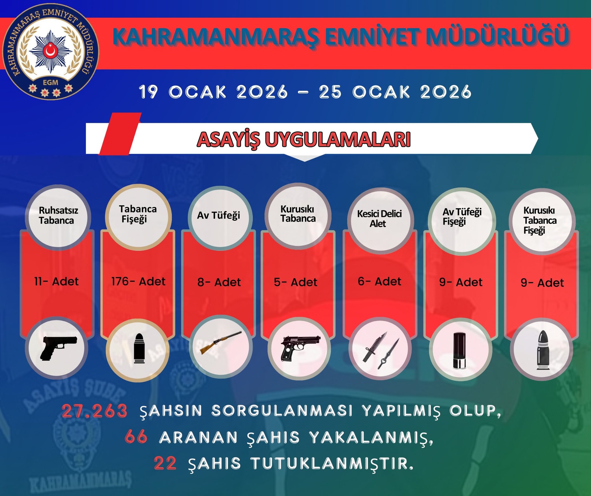 Kahramanmaraş Emniyet Müdürlüğü, 19-25 Ocak 2026 tarihleri arasında gerçekleştirdiği asayiş uygulamalarının sonuçlarını kamuoyuyla paylaştı. Yapılan açıklamada, bir hafta boyunca kent genelinde 27.263 kişinin sorgulandığı, bu sorgulamalar sonucunda 66 aranan şahsın yakalandığı bildirildi. Emniyet güçlerinin titiz çalışması sonucu, farklı suç unsurlarına da el konuldu. Bu süreçte 22 kişi tutuklanarak cezaevine gönderildi. Denetimlerde ruhsatsız tabancalardan fişeklere kadar birçok yasa dışı unsur ele geçirildi.