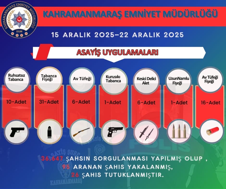 Kahramanmaraş Emniyet Müdürlüğü, 15–22 Aralık 2025 tarihleri arasında il genelinde gerçekleştirdiği asayiş uygulamalarının sonuçlarını kamuoyuyla paylaştı. Kentin farklı noktalarında yapılan denetim ve uygulamalarda, suç ve suçluyla mücadele kapsamında yoğun bir çalışma yürütüldü. Açıklanan verilere göre, söz konusu tarihler arasında toplam 36 bin 947 kişinin sorgulaması yapıldı. Yapılan kontroller sonucunda 95 aranan şahıs yakalanırken, adli makamlara sevk edilen 26 kişi tutuklanarak cezaevine gönderildi.