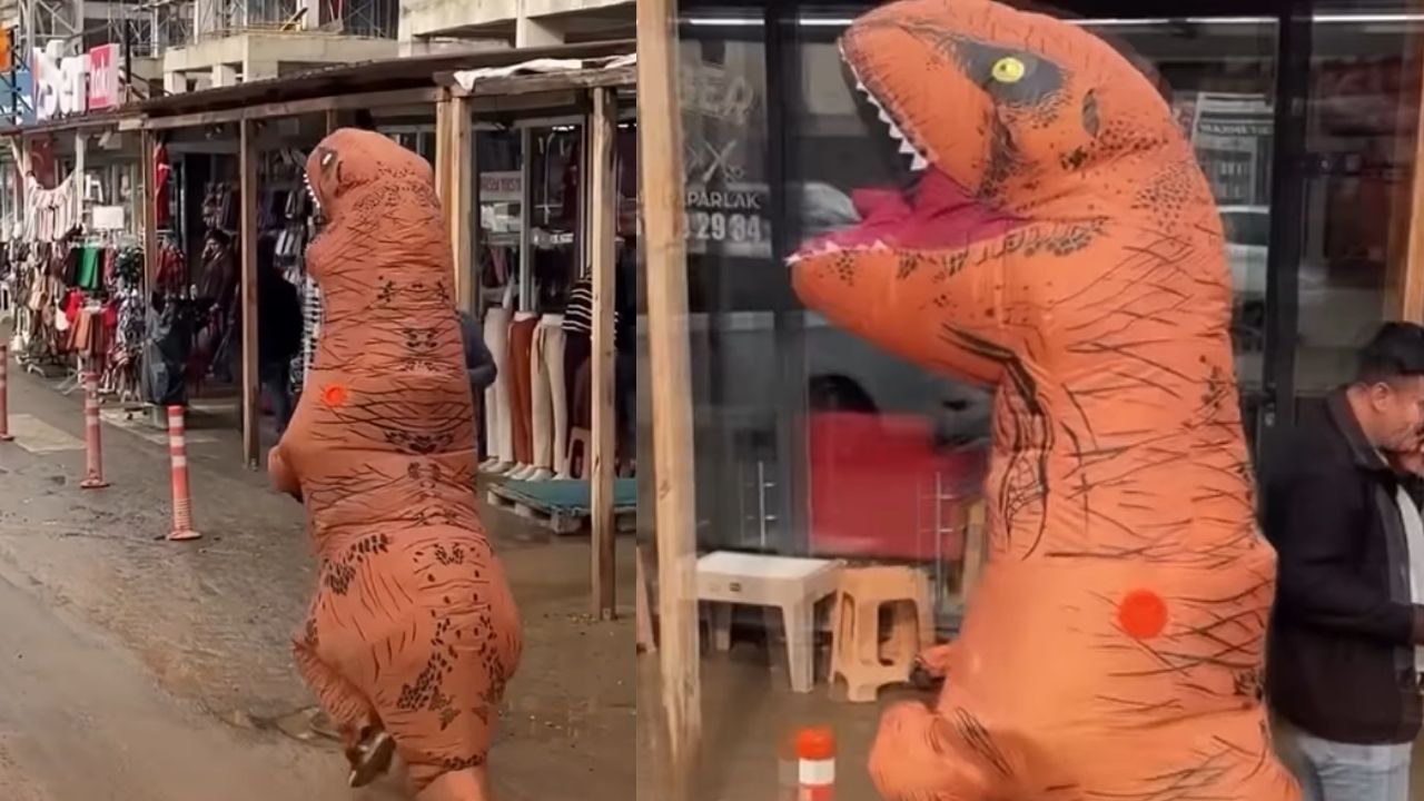 Özellikle çocukların büyük ilgi gösterdiği kostümlü vatandaş, etraftakilere el sallayıp poz vererek eğlenceli anlar yaşattı. Dinozor kostümünün neden giyildiğine dair resmi bir açıklama yapılmazken, görgü tanıkları olayın reklam çalışması olabileceğini belirtiyor.