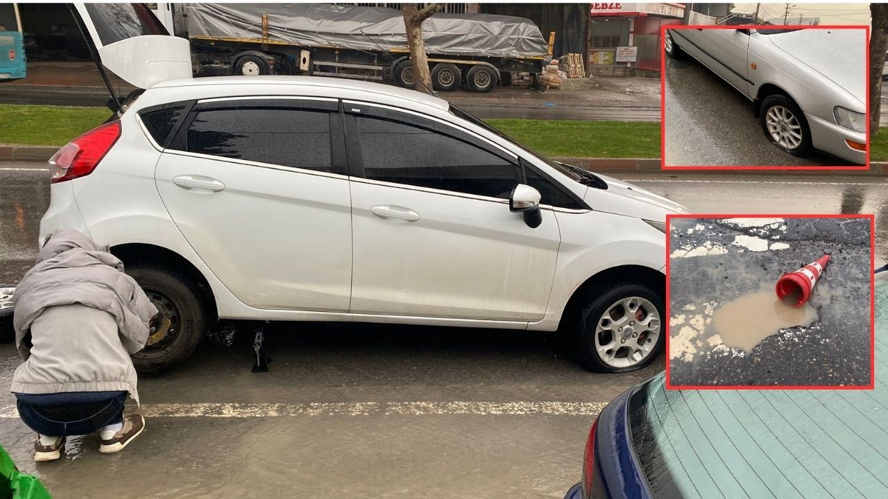 Kentte en fazla hasarın görüldüğü noktalardan biri olarak gösterilen Hal Kavşağı’nda bir sürücünün aracı, yağış sonrası oluşan çukura düştü. Lastiği patlayan araçta hasar meydana geldi.