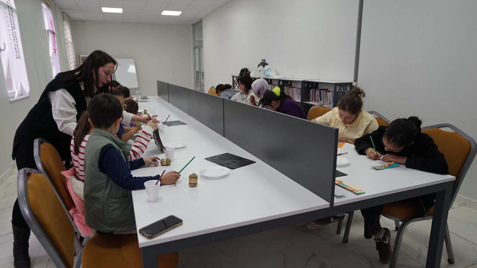 Atölye kapsamında çocuklar, renkli kartonlar, boyalar ve çeşitli süsleme materyalleri kullanarak kendi kitap ayraçlarını hazırladı.