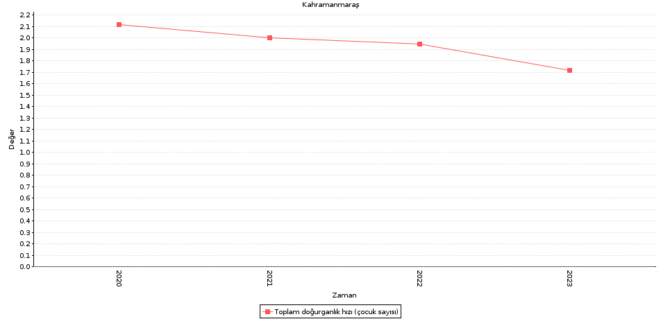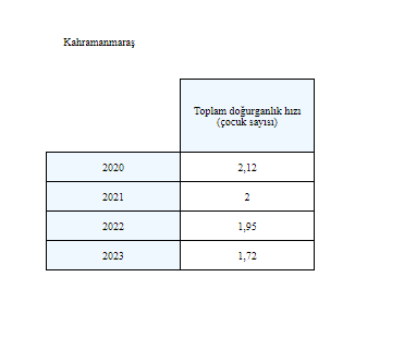 2023 yılı itibarıyla doğurganlık hızı 1,72’ye kadar düştü. Bu, Kahramanmaraş'ta doğurganlık oranlarının son yıllarda sürekli bir azalma gösterdiğini ortaya koyuyor ve bu düşüş, yerel yönetimler ve politika yapıcılar için dikkate alınması gereken bir konu haline geldi.