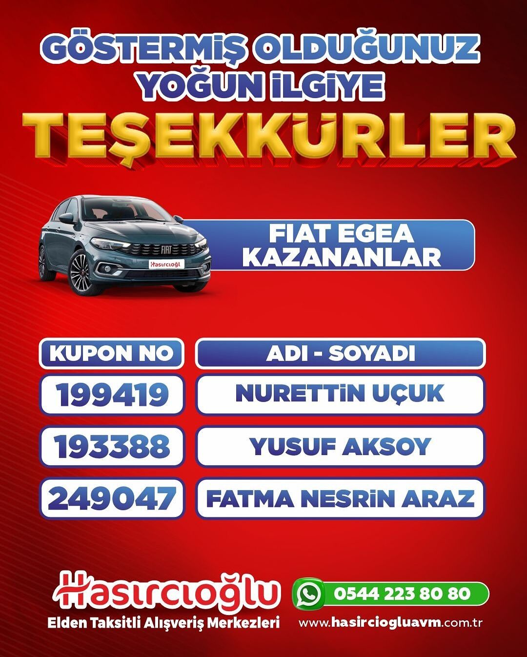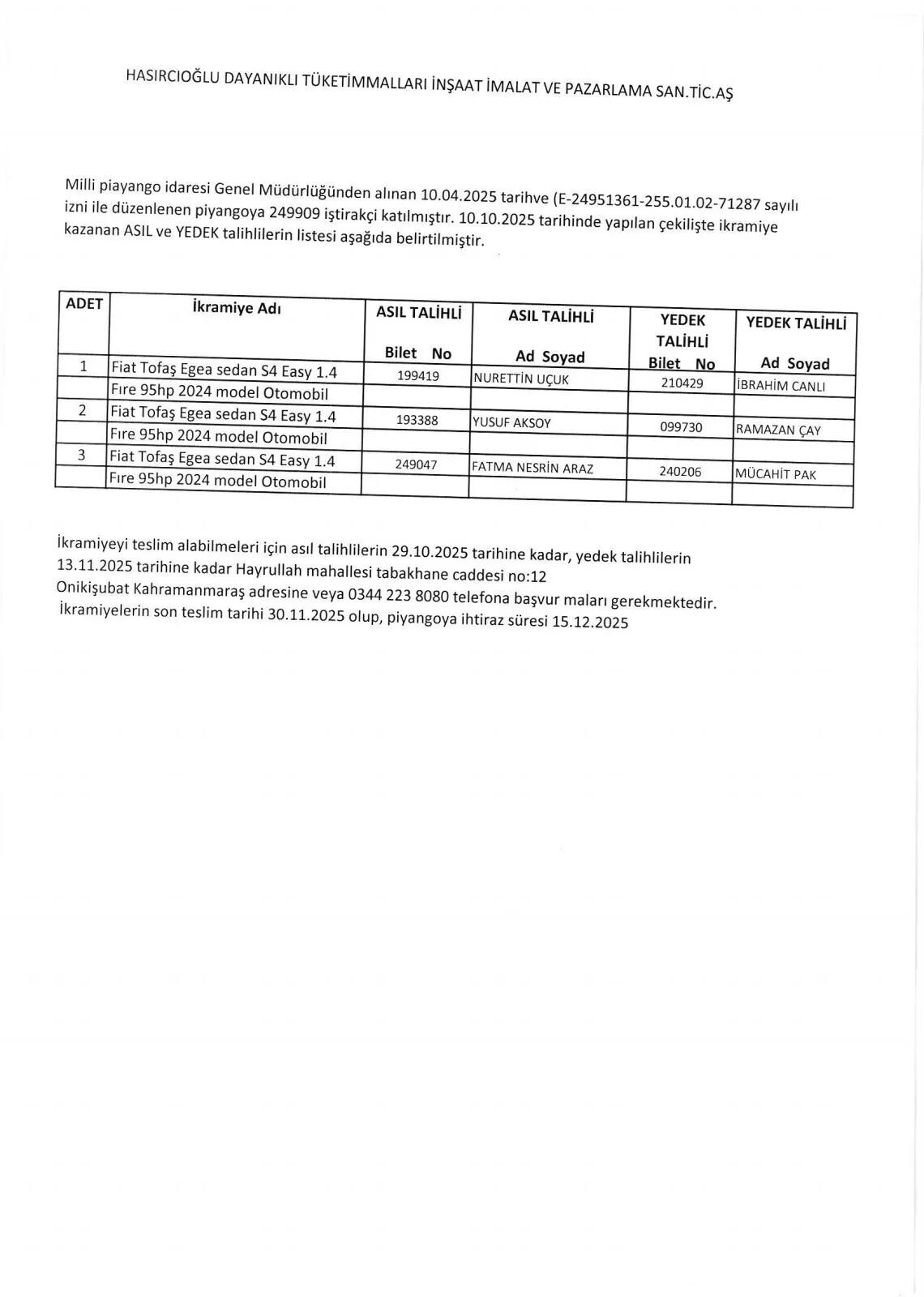 10 Ekim 2025 tarihinde gerçekleştirilen çekilişte, kazanan asıl ve yedek talihliler belirlendi. Birinci Fiat Tofaş Egea, 199419 bilet numarasıyla Nurettin Uçuk’a çıktı. Yedek talihli ise 210429 bilet numarasıyla İbrahim Canlı oldu. İkinci otomobilin sahibi 193388 bilet numarasıyla Yusuf Aksoy, yedek talihli ise 099730 bilet numarasıyla Ramazan Çay olarak kayıtlara geçti. Üçüncü otomobil ise 249047 bilet numarasıyla Fatma Nesrin Araz’a çıktı; yedek talihli 240206 bilet numarasıyla Mücahit Pak oldu.