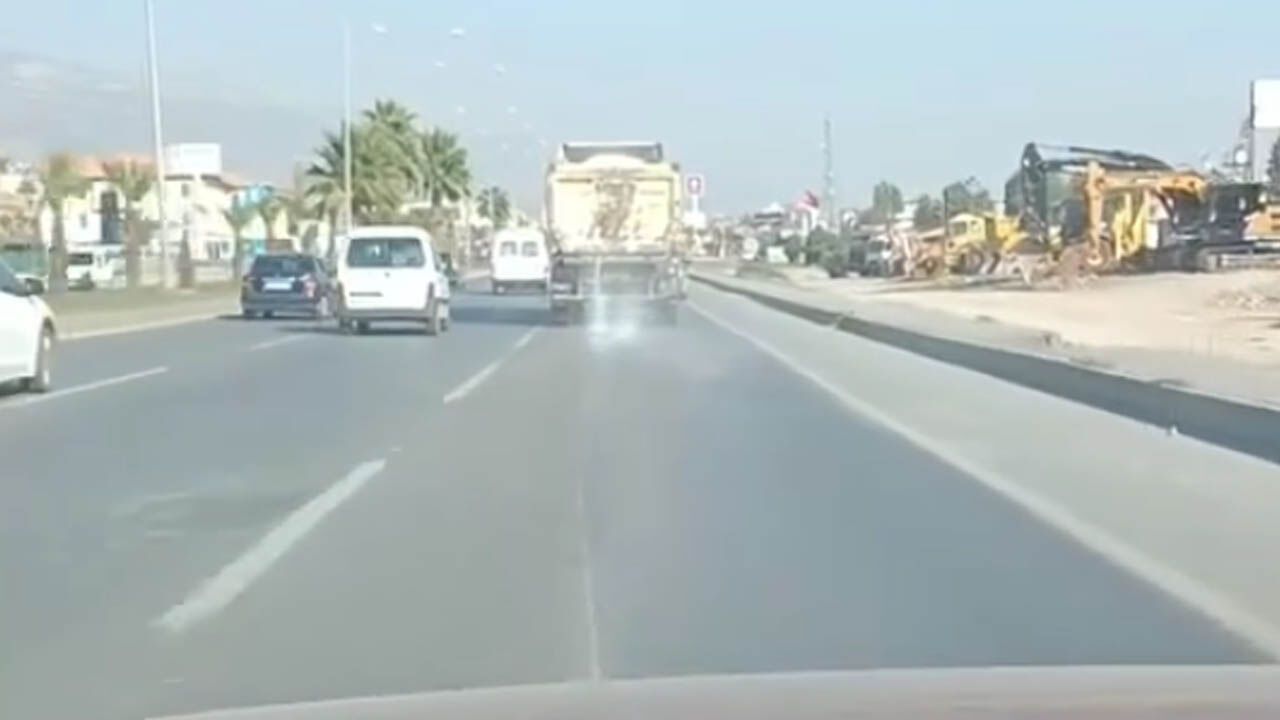 Kahramanmaraş'ta kasasındaki kumları yola dökerek ilerleyen hafriyat kamyonu trafik güvenliğini tehlikeye attı.