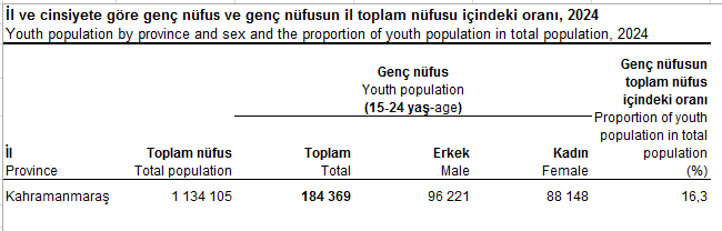 Toplam nüfusun yaklaşık altıda birini oluşturan gençler, Kahramanmaraş’ın geleceği açısından kritik bir rol oynuyor. Eğitim, istihdam ve sosyal politikaların şekillendirilmesinde bu verilerin önemi büyük.