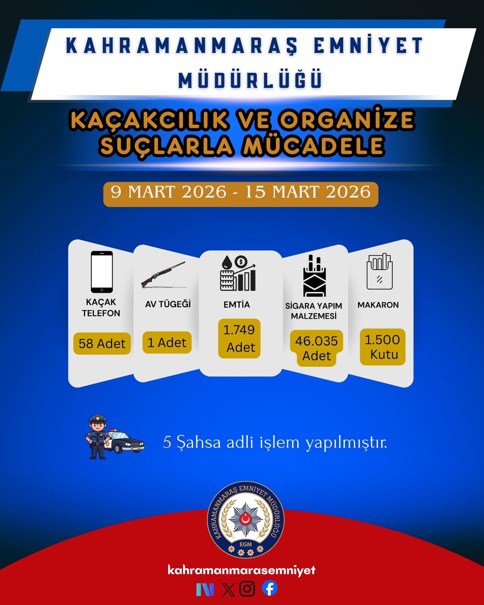 Kahramanmaraş’ta emniyet ekipleri tarafından kaçakçılık ve organize suçlara yönelik yürütülen çalışmalar kapsamında önemli bir operasyon gerçekleştirildi. Kahramanmaraş Emniyet Müdürlüğü ekipleri tarafından 9 Mart 2026 ile 15 Mart 2026 tarihleri arasında gerçekleştirilen denetim ve operasyonlarda çok sayıda kaçak ürün ele geçirildi.