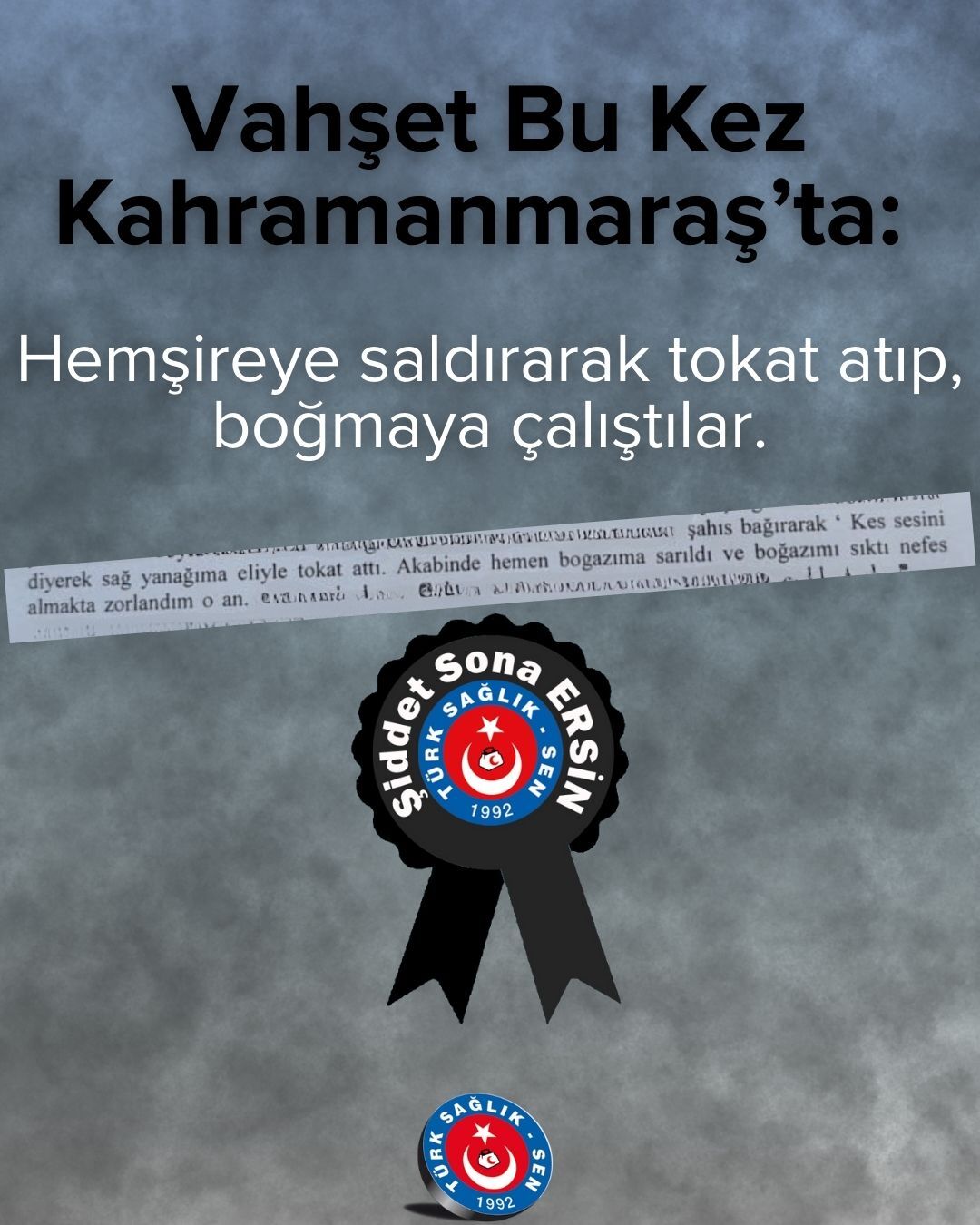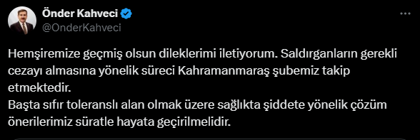 “Hemşiremize geçmiş olsun dileklerimi iletiyorum. Saldırganların gerekli cezayı almasına yönelik hukuki süreci Kahramanmaraş şubemiz yakından takip etmektedir. Başta ‘sıfır toleranslı alan’ uygulaması olmak üzere, sağlıkta şiddete karşı geliştirdiğimiz çözüm önerileri süratle hayata geçirilmelidir.”