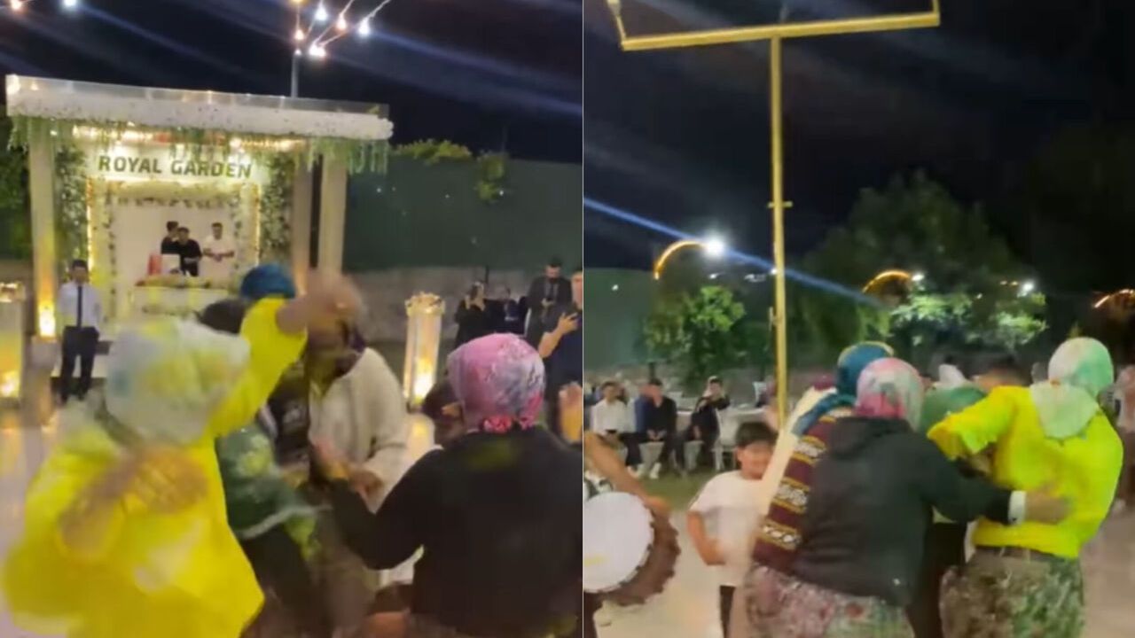 Olay, düğünün en coşkulu anlarından birinde gerçekleşti. Davetlilerin pisti doldurduğu sırada, beklenmedik bir şekilde kadın elbiseleri giymiş ve yüzlerini gizlemiş bir grup, damadın bulunduğu alana doğru ilerledi. İlk başta ne olduğunu anlamayan davetliler, grubun damada yönelmesiyle kısa süreli bir şaşkınlık yaşadı. Grubun damadı kollarına alıp hızla düğün salonundan uzaklaştırması, salonda hem kahkahalara hem de "ne oluyor?" nidalarına yol açtı.