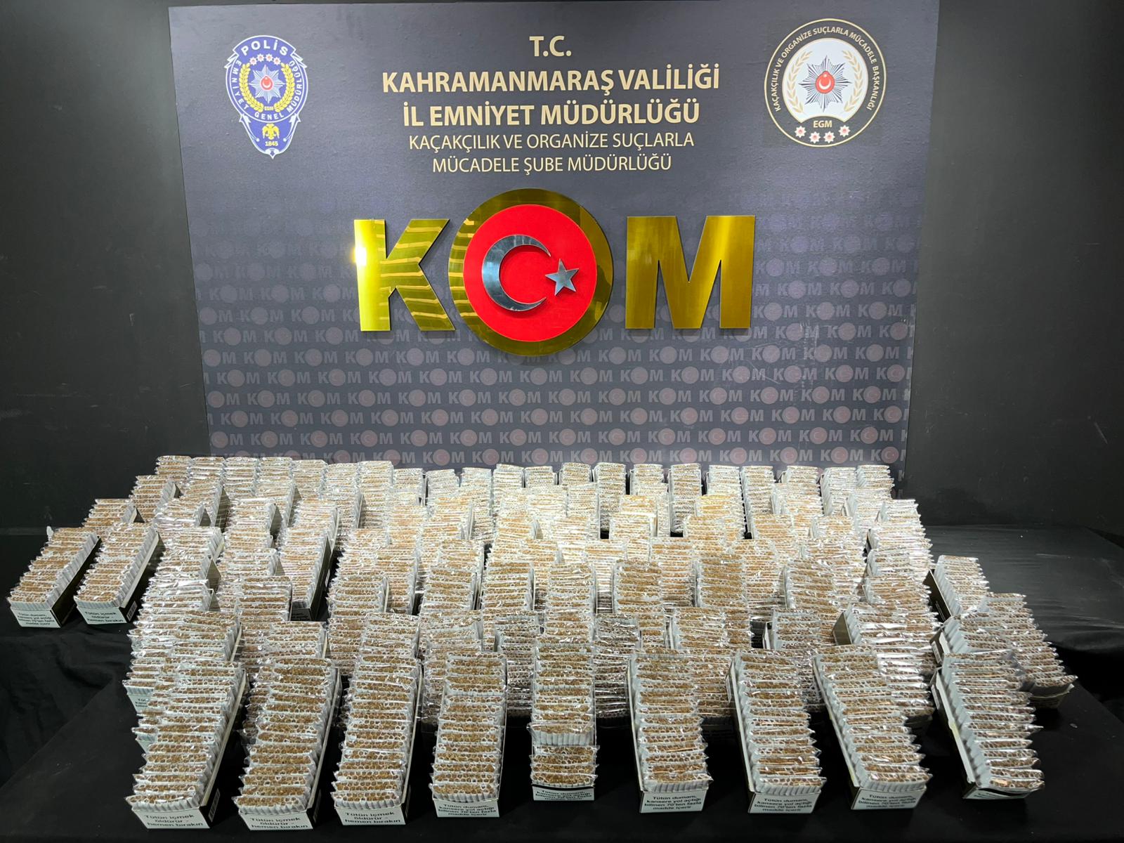 Kahramanmaraş KOM Şube Müdürlüğü ekiplerince 5 Şubat 2026 tarihinde yapılan çalışmada, şeffaf poşetler içerisinde paketlenmiş halde 1.500 paket, toplamda 30 bin dal kıyılmış tütünle doldurulmuş makaron sigara ele geçirildi. Kaçak ürünlerin piyasaya sürülmek üzere hazırlandığı değerlendirildi.
