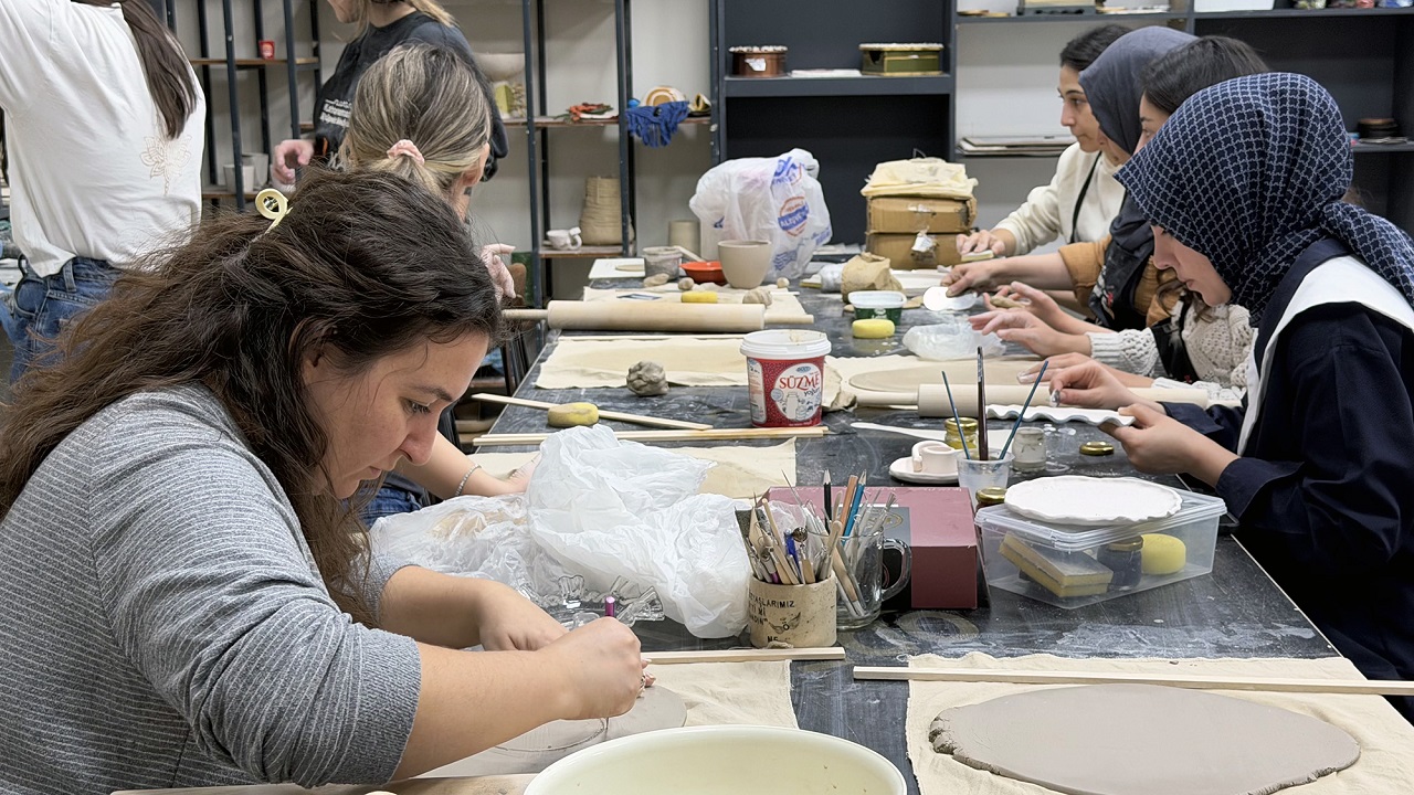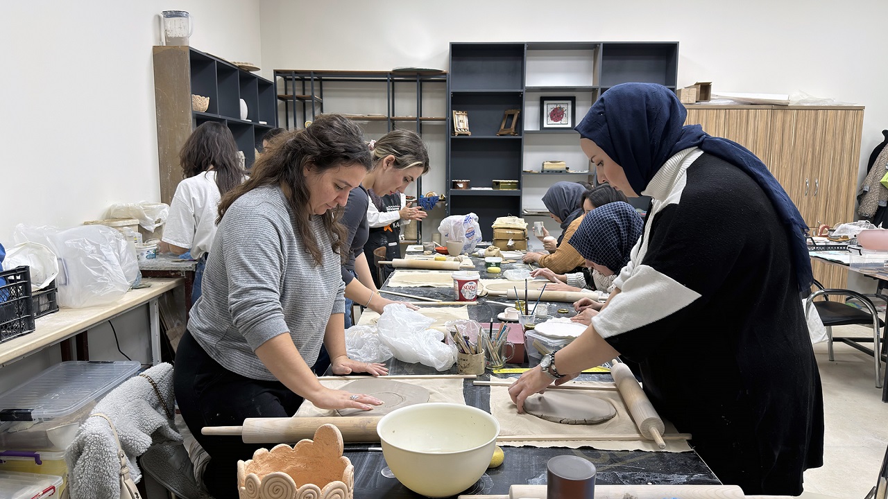 Seramik sanatının tüm aşamalarının öğretildiği atölyede, kursiyerler aldıkları teorik bilgileri pratiğe dönüştürerek kendi el emeği eserlerini üretmenin mutluluğunu yaşıyor.
