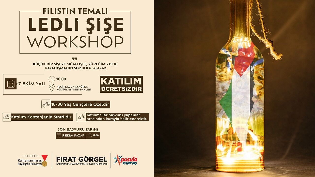 7 Ekim Salı günü Necip Fazıl Kısakürek Kültür Merkezi bahçesinde gerçekleştirilecek atölye çalışmasında, “Filistin Temalı Ledli Şişe” etkinliği düzenlenecek. 18–30 yaş arası gençlerin katılımına açık olan çalışmada, küçük şişelere yerleştirilecek ışıklar, hem dayanışmanın hem de Filistin halkına destek mesajının simgesi olacak.