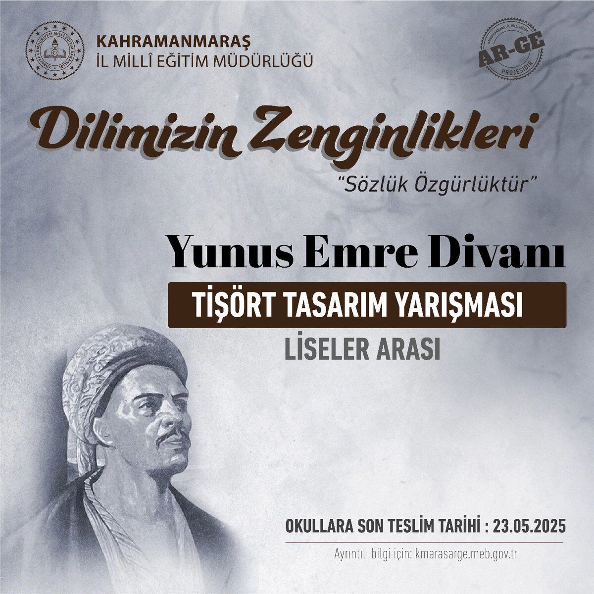 Mayıs ayı boyunca düzenlenecek olan "Yunus Emre Divanı Tişört Tasarım Yarışması" ile lise öğrencilerinin hem milli edebiyatımıza hem de görsel sanatlara olan ilgisinin artırılması hedefleniyor. Yarışmaya dair tüm detaylar ve şartname, https://kmarasarge.meb.gov.tr adresinde yayımlandı.