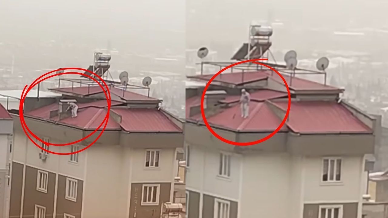 Çatının en uç noktasına kadar ilerleyen vatandaş, dengesini kaybetme riskine aldırış etmeden dakikalarca çalıştı. Bu tehlikeli anlar, çevredeki vatandaşlar tarafından cep telefonlarıyla kaydedildi.