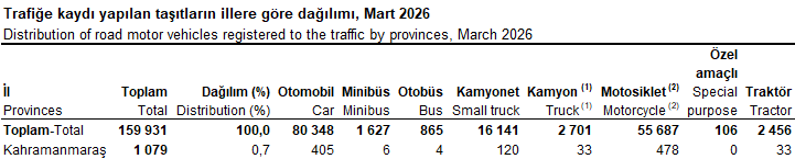 Türkiye genelinde Mart ayında trafiğe kaydı yapılan 159 bin 931 taşıt içerisinde Kahramanmaraş, yerel bazda istikrarlı büyümesini korudu. Ülke genelinde Mart ayında trafiğe kaydı yapılan araçların yaklaşık yarısını otomobiller (80 bin 348) oluştururken, motosikletler (55 bin 687) ikinci sırada yer aldı. Kahramanmaraş’ın bu trende uyum sağladığı, hatta motosiklet kaydında yerel bazda otomobili geride bıraktığı gözlemlendi.