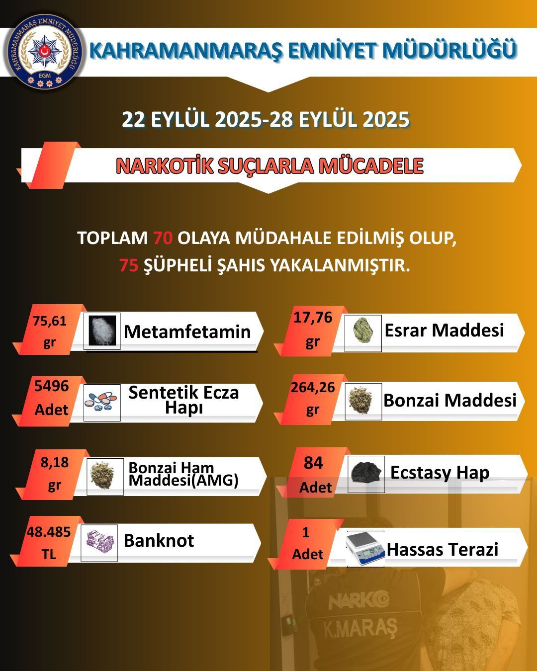 İl Emniyet Müdürlüğü Narkotik Suçlarla Mücadele birimleri, 22–28 Eylül 2025 tarihleri arasında kent genelinde yürüttüğü operasyonlarda toplam 70 olaya müdahale etti. Operasyonlar sırasında 75 şüpheli şahıs yakalanarak adli işlem başlatıldı. Emniyet yetkilileri, çalışmanın şehir genelinde uyuşturucu ticareti ve kullanımını engellemeye yönelik sürdürüldüğünü açıkladı.