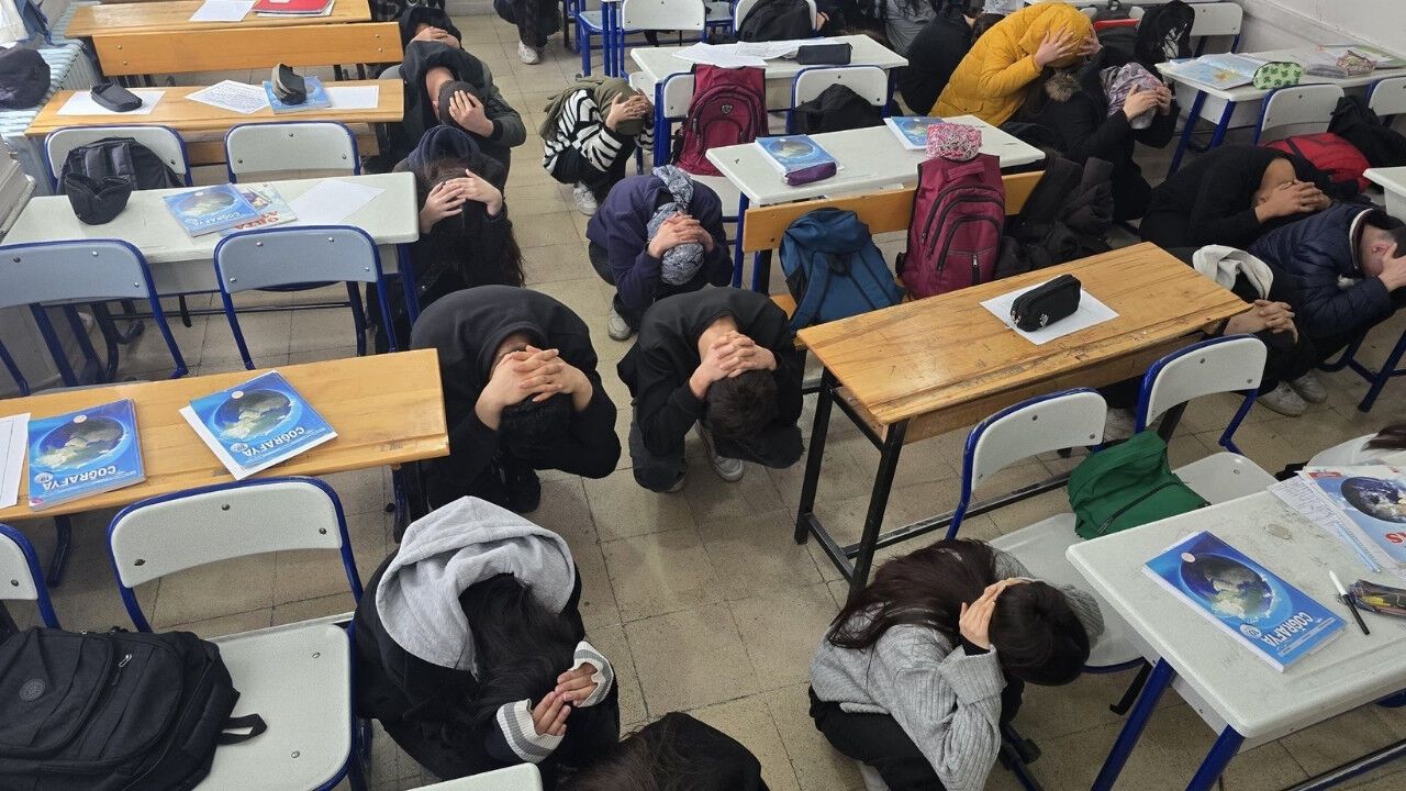 Uzman ekipler tarafından gerçekleştirilen eğitimde, deprem sırasında “çök–kapan–tutun” yöntemi başta olmak üzere hayat kurtaran temel kurallar öğrencilere aktarıldı. Öğrencilerin afetlere karşı bilinçlenmesi ve doğru davranış alışkanlıklarının kazandırılması amacıyla yapılan eğitimde, öğretmenler de bilgilendirildi.