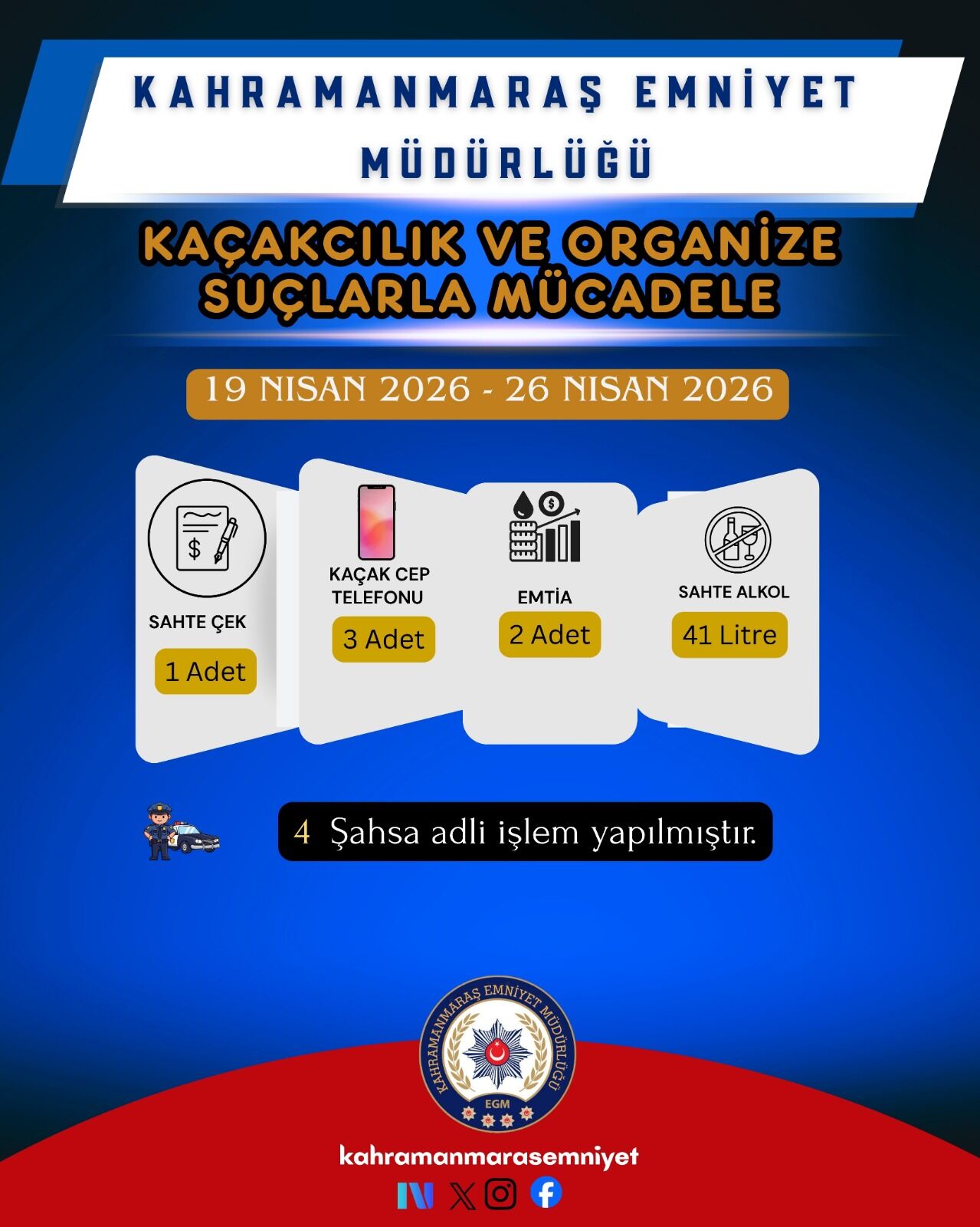 Kahramanmaraş İl Emniyet Müdürlüğü bünyesinde faaliyet gösteren Kaçakçılık ve Organize Suçlarla Mücadele (KOM) Şube Müdürlüğü, şehir genelinde ekonomik suçlara ve kaçakçılığa yönelik yürüttüğü kararlı operasyonların bir haftalık bilançosunu kamuoyuna duyurdu. 19 Nisan ile 26 Nisan 2026 tarihleri arasını kapsayan operasyonlarda, piyasaya sürülerek haksız kazanç elde edilmeye çalışılan sahte alkolden kaçak cep telefonlarına, sahte çeklerden emtia ürünlerine kadar birçok suç unsuru ele geçirildi. Kahramanmaraş polisinin titiz takibi sonucu gerçekleştirilen baskınlarda 4 şahıs hakkında adli işlem başlatılırken, emniyet birimleri kaçakçılık faaliyetlerine karşı mücadelenin tavizsiz bir şekilde devam edeceğini vurguladı.