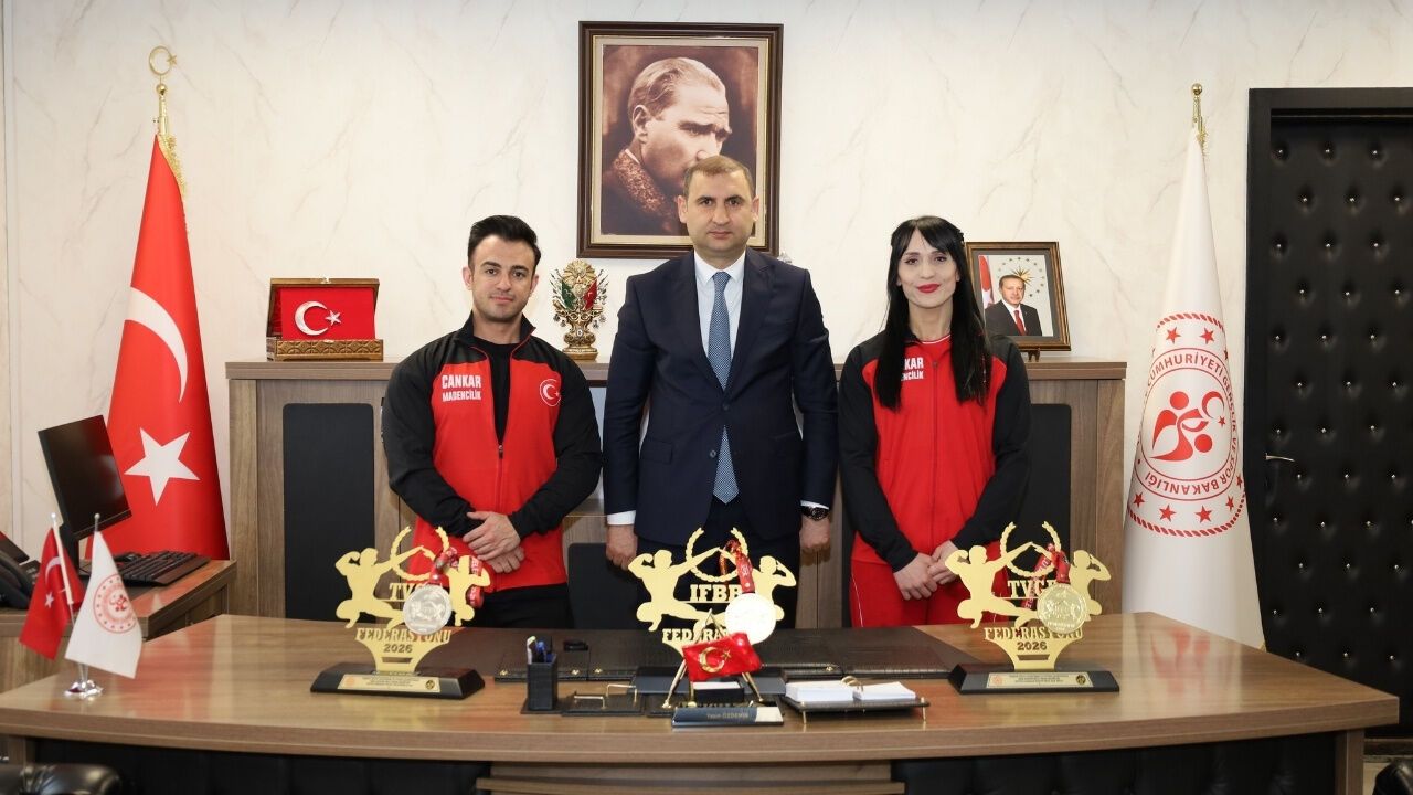 Kahramanmaraş, vücut geliştirme ve fitness branşında elde edilen tarihi başarılarla gurur duyuyor. 25-28 Mart tarihlerinde düzenlenen Türkiye Vücut Geliştirme ve Fitness Şampiyonası’nda altın madalya kazanarak Türkiye şampiyonu olan ve ardından Balkan Şampiyonası’nda ay-yıldızlı bayrağı dalgalandırarak şampiyonluğa ulaşan Sinem Seyfi, başarılarını taçlandırmaya devam ediyor. Aynı şampiyonada Türkiye ikincisi olarak büyük bir başarıya imza atan Öner Seyfi ile birlikte, İl Temsilcisi Serhat Kara eşliğinde Kahramanmaraş Gençlik ve Spor İl Müdürü Yasin Özdemir’i makamında ziyaret ettiler. Şehrin spor tarihine isimlerini altın harflerle yazdıran sporcular, hazırlık süreçlerini ve şampiyonluk kürsüsüne giden yolda yaşadıkları zorlukları İl Müdürü Özdemir’e aktardılar. İşte Kahramanmaraşlı devlerin başarı dolu hikayesi ve ziyaretten öne çıkan önemli başlıklar…