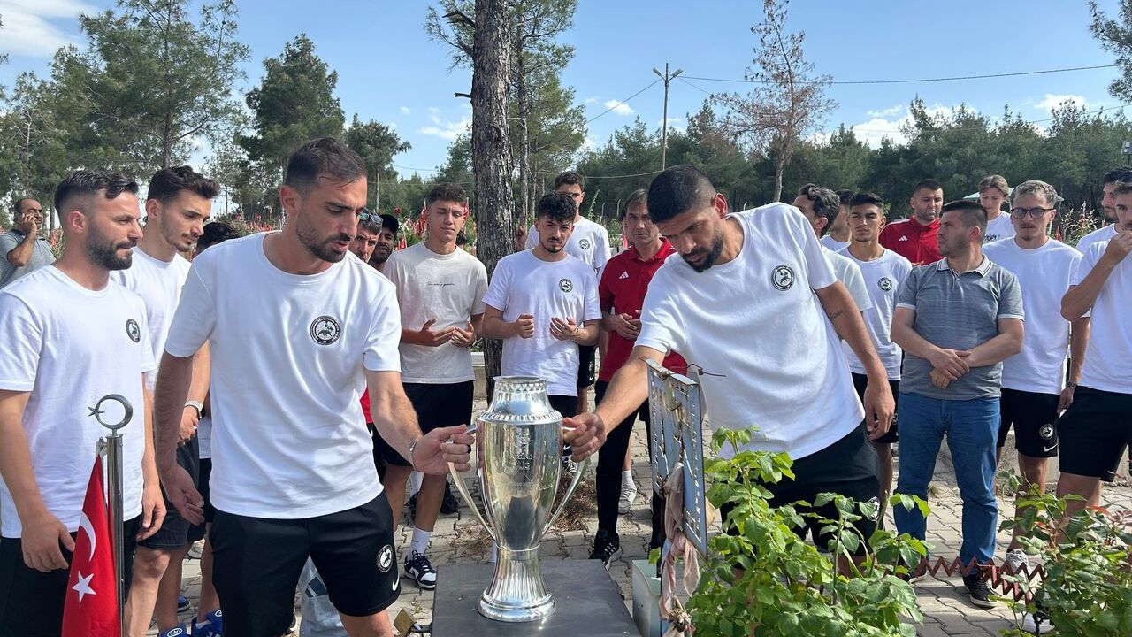Antalya'da elde ettikleri zaferin coşkusu henüz tazeyken, futbolcuların şehitlik ziyareti duygusal anlara sahne oldu. Ellerinde şampiyonluk kupalarıyla şehitliğe gelen futbolcular, depremde yitirdiğimiz canlar için gözyaşı döktüler. Yapılan duaların ardından futbolcular, depremde hayatını kaybeden takım arkadaşlarının mezarlarına karanfiller bıraktılar.