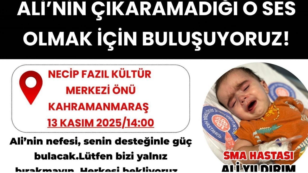 Kahramanmaraş’ta SMA (Spinal Musküler Atrofi) hastası Ali Yıldırım için duyulan çağrı, kentte büyük yankı uyandırdı. Ali’nin sesi olabilmek ve nefesine destek olmak isteyen vatandaşlar, 13 Kasım 2025 Perşembe günü Necip Fazıl Kültür Merkezi önünde bir araya gelecek.