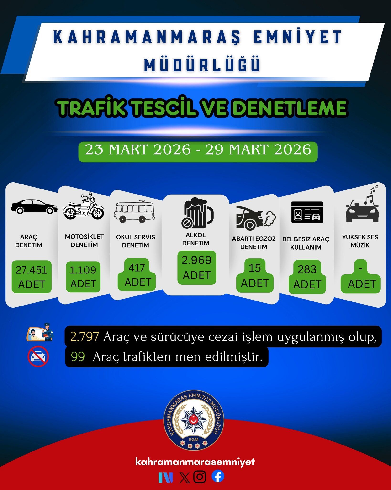Kahramanmaraş yollarında güvenliğin sağlanması ve trafik kazalarının asgariye indirilmesi amacıyla yürütülen denetimlerin haftalık bilançosu netleşti. 30 Mart 2026 Pazartesi günü Kahramanmaraş Emniyet Müdürlüğü tarafından paylaşılan verilere göre, trafik polisleri sadece ana arterlerde değil, okul çevrelerinden motosiklet yoğunluklu bölgelere kadar şehrin her noktasında denetim gerçekleştirdi. Bir haftalık süreçte on binlerce sürücünün evrak ve güvenlik kontrolleri yapılırken, çevreyi rahatsız eden abartı egzozlu araçlar da unutulmadı. Peki, Kahramanmaraş trafiğindeki bu dev denetimin sayısal verileri neler ve en çok hangi ihlallerden ceza kesildi? İşte bir haftalık trafik raporunun tüm ayrıntıları…