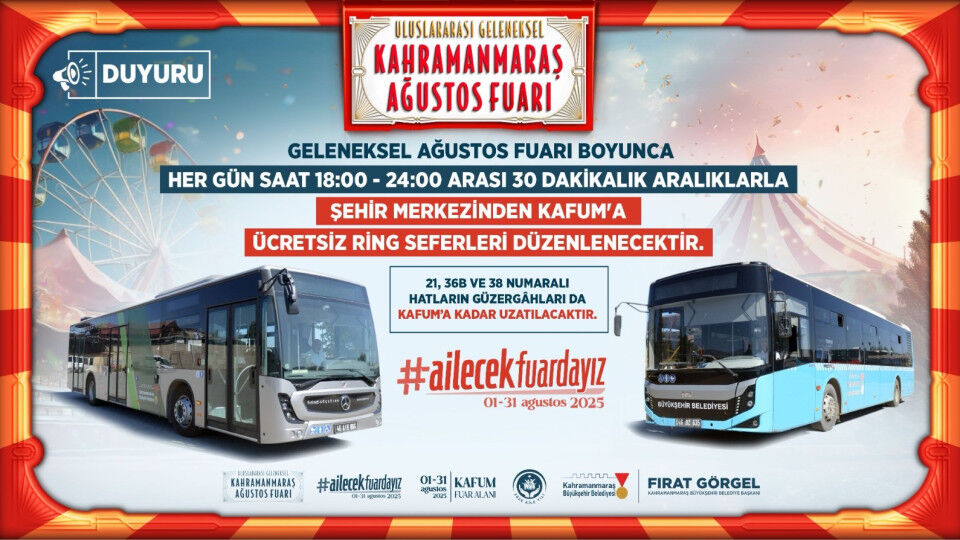Kahramanmaraş Büyükşehir Belediyesi’nden yapılan açıklamada, “Ağustos Fuarı süresince tüm hemşehrilerimizin etkinliklere kolayca katılım sağlayabilmesi için ulaşım altyapımızı güçlendiriyoruz. Ücretsiz ring seferleri ve uzatılan toplu taşıma güzergahlarıyla KAFUM’a erişim artık çok daha rahat. Şehrimizin sosyal ve kültürel hayatına büyük katkı sağlayacak fuar organizasyonuna halkımızı davet ediyoruz” denildi.