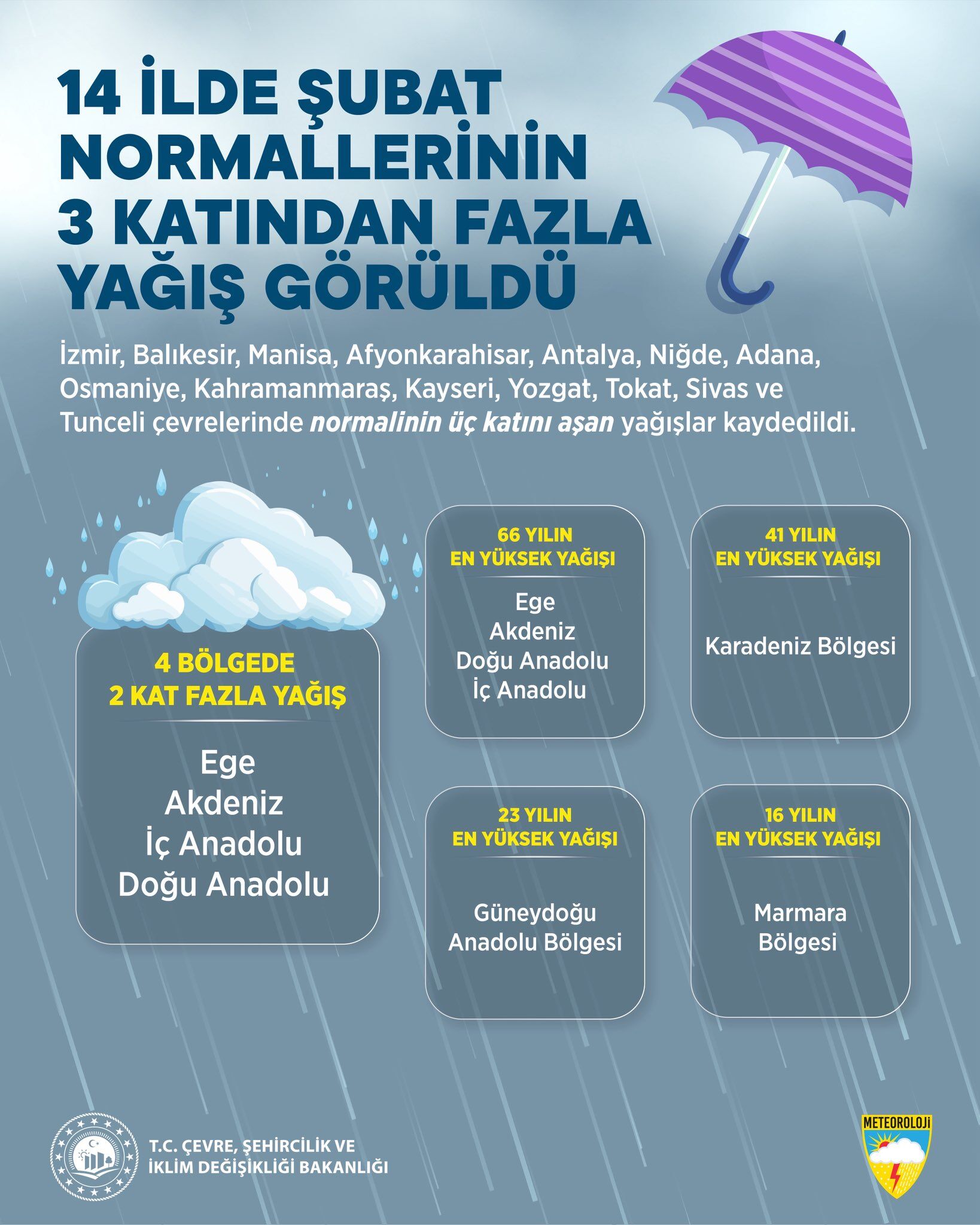 Bakanlık tarafından paylaşılan verilere göre bazı illerde yağış miktarı normal değerlerin yaklaşık üç katına kadar çıktı. Bu iller arasında İzmir, Balıkesir, Manisa, Afyonkarahisar, Antalya, Niğde, Adana, Osmaniye, Kahramanmaraş, Kayseri, Yozgat, Tokat, Sivas ve Tunceli yer aldı.