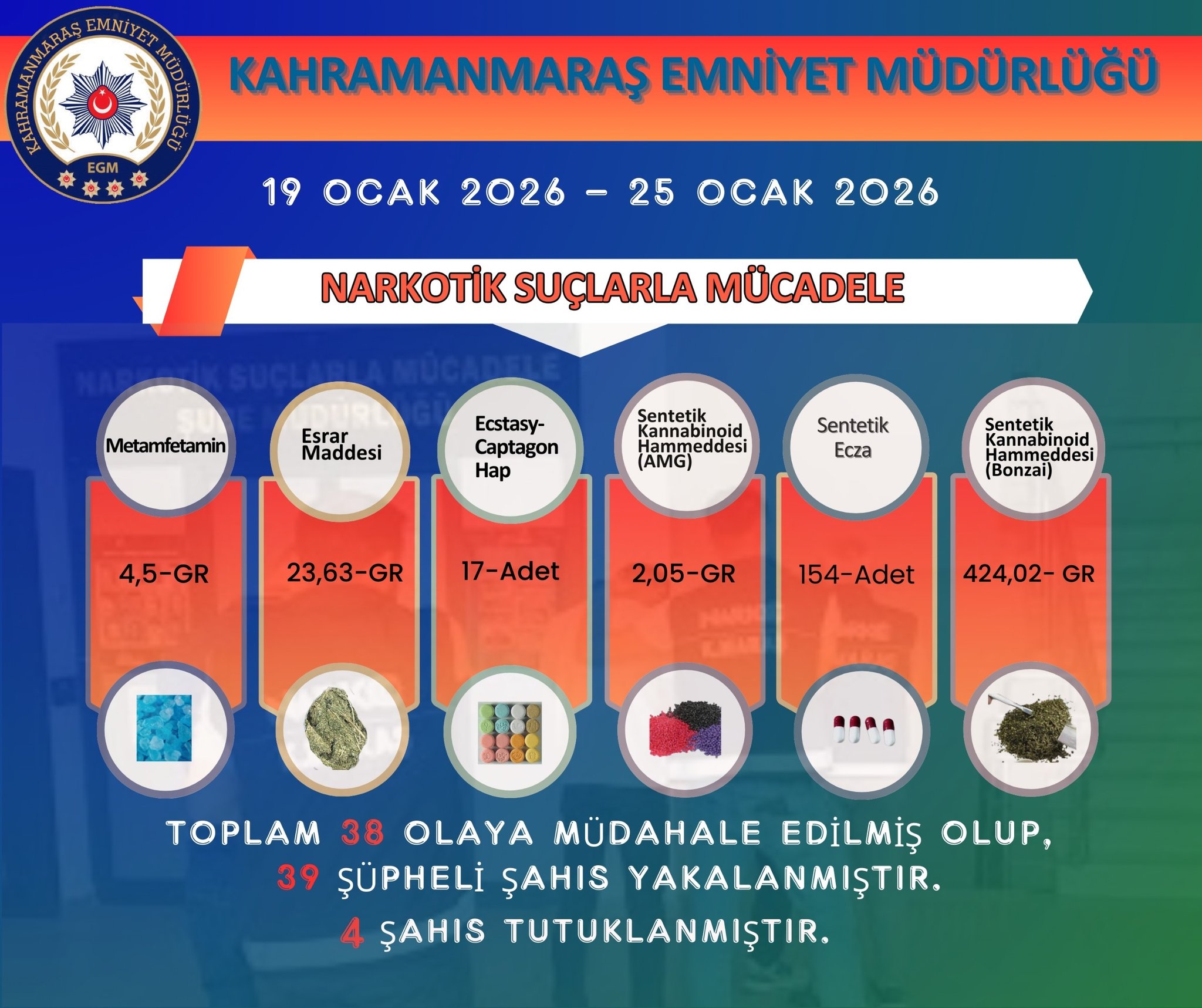 Kahramanmaraş’ta uyuşturucu madde kullanımı ve ticaretiyle mücadele kapsamında 19-25 Ocak 2026 tarihleri arasında düzenlenen operasyonlarda dikkat çekici veriler paylaşıldı. Emniyet birimleri tarafından yürütülen 38 ayrı olaya müdahale edilirken, 39 şüpheli gözaltına alındı. Yapılan adli işlemler sonucunda 4 kişi tutuklanarak cezaevine gönderildi. Operasyonlarda çok sayıda uyuşturucu maddeye de el konuldu.