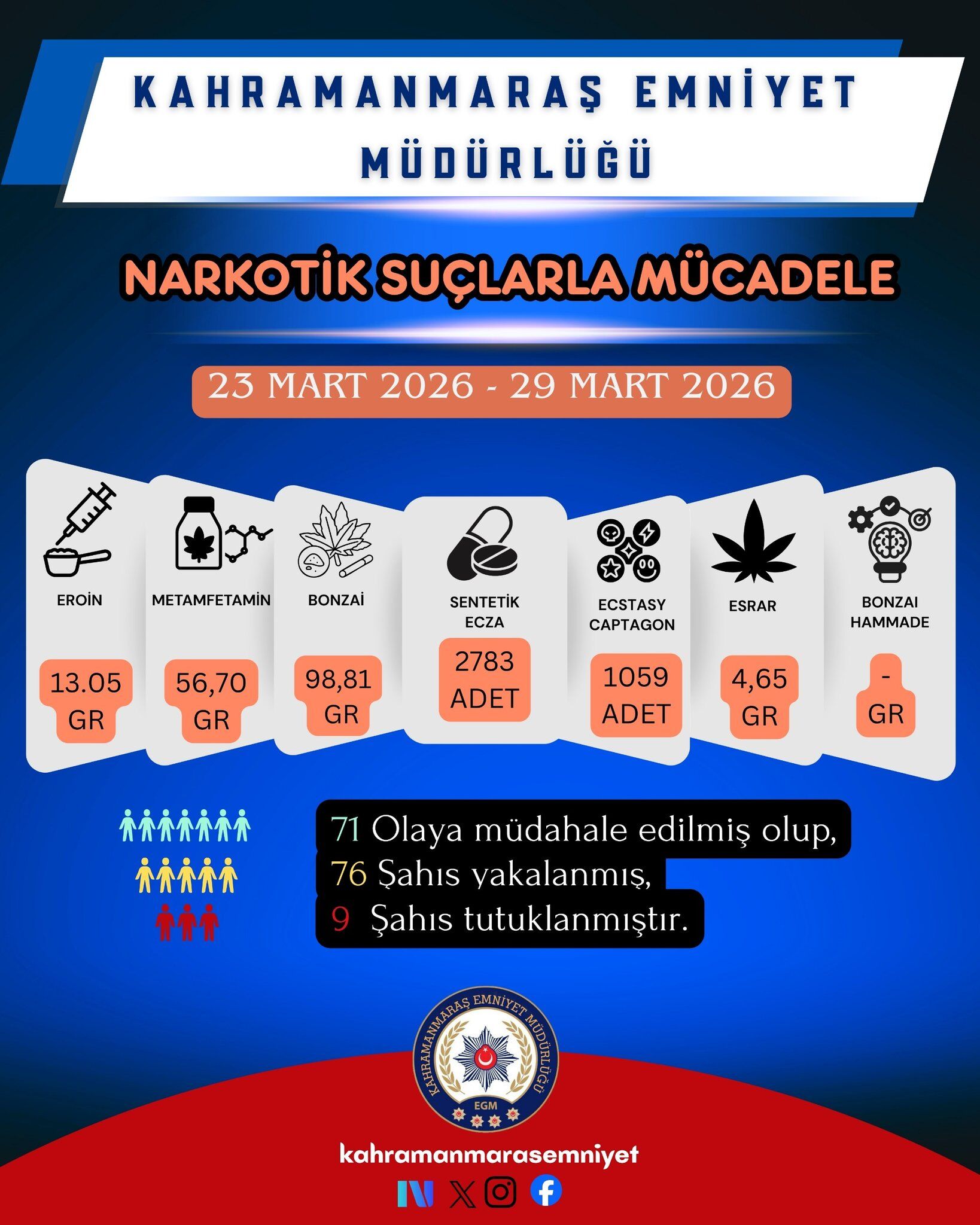 Hafta boyunca titizlikle yürütülen 71 ayrı operasyon neticesinde toplam 76 şahıs yakalanarak gözaltına alındı. Emniyetteki sorguları tamamlanan ve "Uyuşturucu veya Uyarıcı Madde Ticareti Yapma" suçlamasıyla adliyeye sevk edilen şahıslardan 9'u tutuklanarak cezaevine gönderildi. Diğer şahıslar hakkında ise adli kontrol ve yasal işlemlerin sürdüğü bildirildi.
