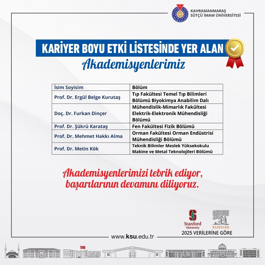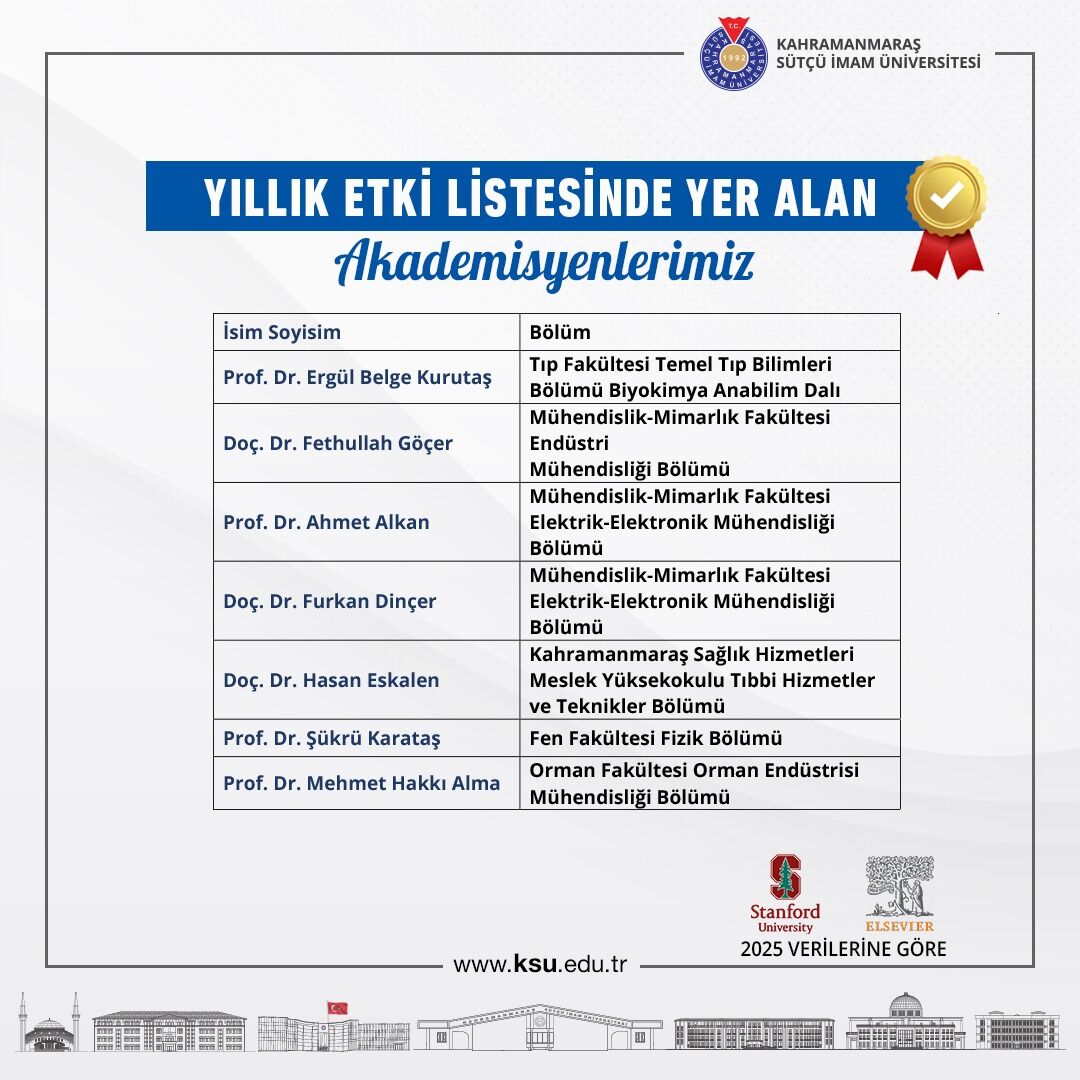 Kahramanmaraş Sütçü İmam Üniversitesi (KSÜ) öğretim üyeleri, bilim dünyasının prestijli ölçütlerinden biri olarak kabul edilen Stanford Üniversitesi tarafından hazırlanan “Dünyanın En Etkili Bilim İnsanları ve Kariyer Boyu Etki” listesine girmeyi başardı. Liste, her yıl uluslararası akademik performans ve etkiyi ölçmek amacıyla yayımlanıyor.
