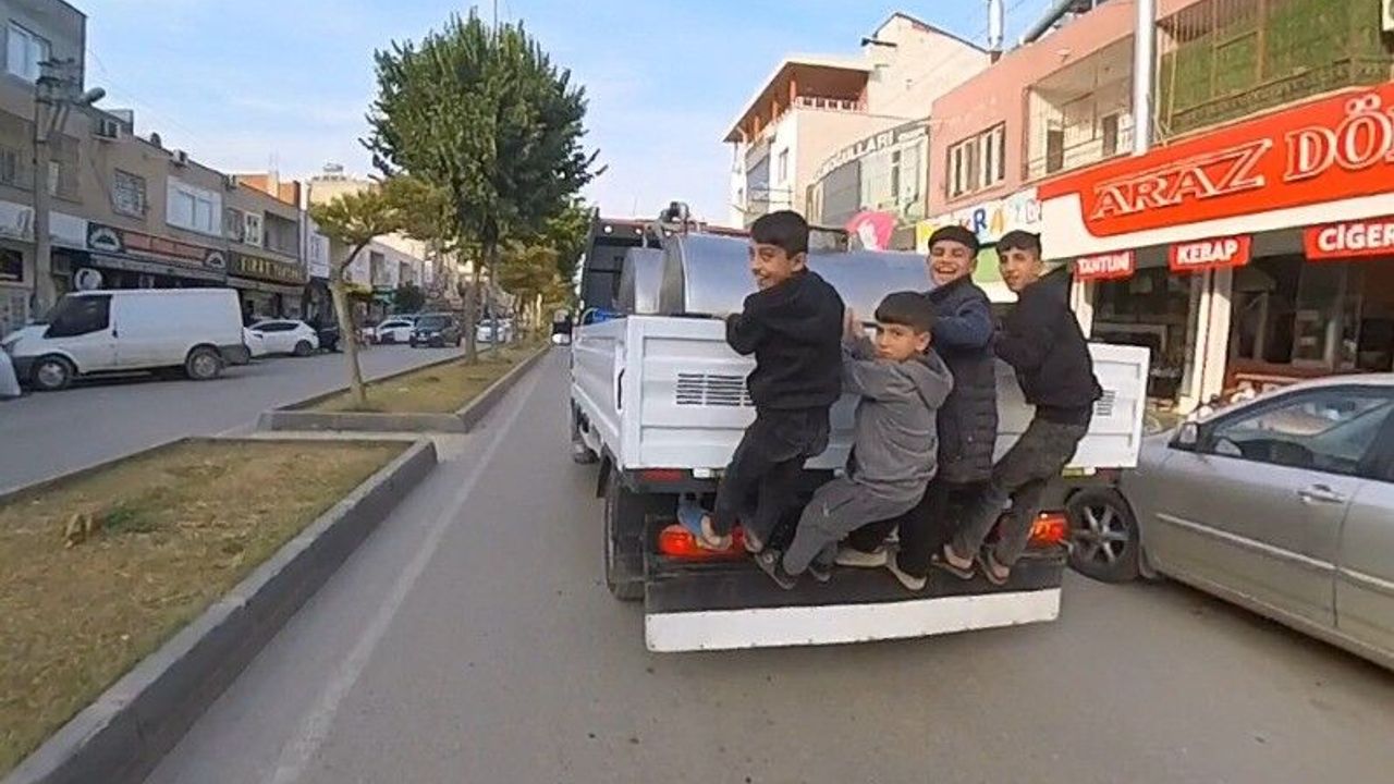 Mersin’de kamyonetin arkasına asılan çocukların tehlikeli yolculuğu yürekleri ağza getirdi.
