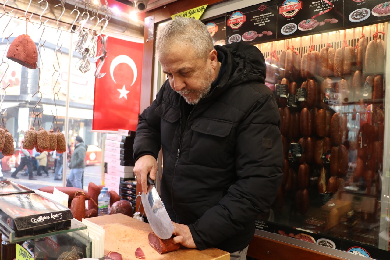 Erciyes’e gelen turistlerin pastırma ve sucuğa yoğun ilgi gösterdiğini belirten pastırmacı Arif Ateş (52), “Zaten pastırma ve sucuğun tam mevsimindeyiz.