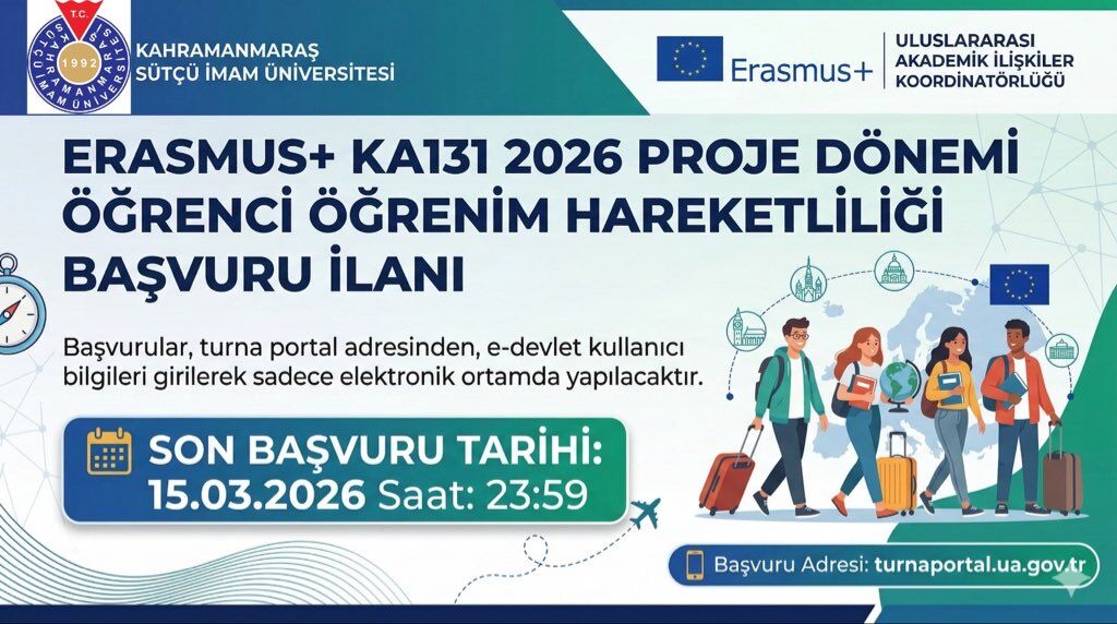 KSÜ tarafından yapılan açıklamaya göre Erasmus+ KA131 öğrenci öğrenim hareketliliği başvuruları 15 Mart 2026 saat 23.59’a kadar devam edecek. Program kapsamında öğrenciler, farklı Avru