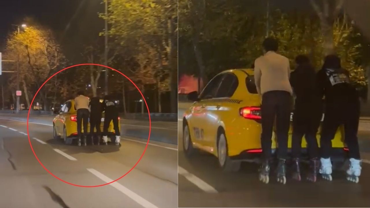 Olay, Maltepe Sahilyolu’nda akşam saatlerinde meydana geldi. Kimlikleri öğrenilemeyen patenli 3 genç, seyir halindeki bir ticari taksinin arkasına tutunarak tehlikeli bir şekilde yol aldı. Gençlerin bu davranışı trafikte seyreden diğer sürücüler için de risk oluşturdu. O anlar, bir başka araç sürücüsü tarafından cep telefonuyla kayda alındı.