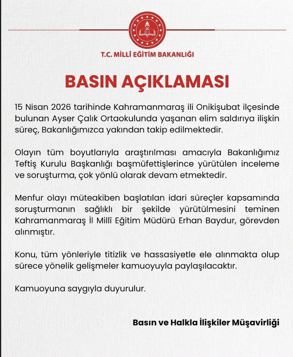 Milli Eğitim Bakanlığı tarafından yapılan resmi basın açıklamasında şu ifadelere yer verildi: "15 Nisan 2026 tarihinde Kahramanmaraş ili Onikişubat ilçesinde bulunan Ayser Çalık Ortaokulunda yaşanan elim saldırıya ilişkin süreç, Bakanlığımızca yakından takip edilmektedir. Menfur olayı müteakiben başlatılan idari süreçler kapsamında soruşturmanın sağlıklı bir şekilde yürütülmesini teminen Kahramanmaraş İl Millî Eğitim Müdürü Erhan Baydur, görevden alınmıştır." Bu açıklama ile birlikte, saldırı sonrası kurum içi sorumluluk zincirine yönelik ilk üst düzey tasarruf gerçekleştirilmiş oldu.