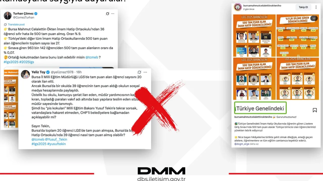 İletişim Başkanlığı Dezenformasyonla Mücadele Merkezi'nden yapılan MEB’in açıklamasına göre, Bursa genelinde 2025 LGS’de 17 farklı okuldan toplam 20 öğrenci 500 tam puan aldı. Bu öğrencilerden sadece 2’si imam hatip ortaokulu mezunu olduğu kaydedilirken, "Dolayısıyla, söz konusu okuldan 39 öğrencinin tam puan aldığı iddiası tamamen asılsız." denildi.