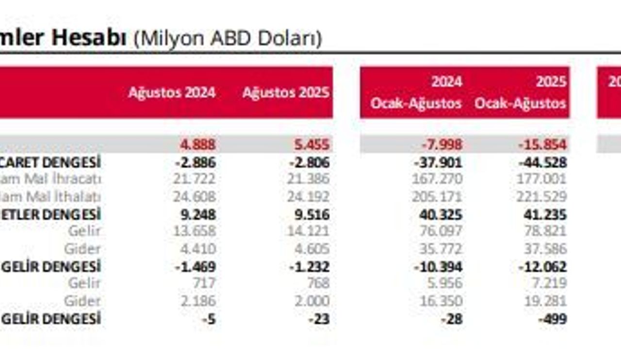 Ödemeler dengesi tanımlı dış ticaret açığı ise 2 milyar 806 milyon dolar olarak gerçekleşti. Yıllıklandırılmış verilere göre, Ağustos ayında cari açık yaklaşık 18,3 milyar dolar, ödemeler dengesi tanımlı dış ticaret dengesi ise 62,6 milyar dolar açık verdi. Aynı dönemde hizmetler dengesi 62,3 milyar dolar fazla verirken, birincil ve ikincil gelir dengesi sırasıyla 17,5 milyar dolar ve 399 milyon dolar açık verdi. Hizmetler dengesi kaynaklı net girişler ise 9 milyar 516 milyon dolar oldu; bunun 2,77 milyar doları taşımacılık hizmetlerinden, 7,66 milyar doları seyahat kaleminden sağlandı.