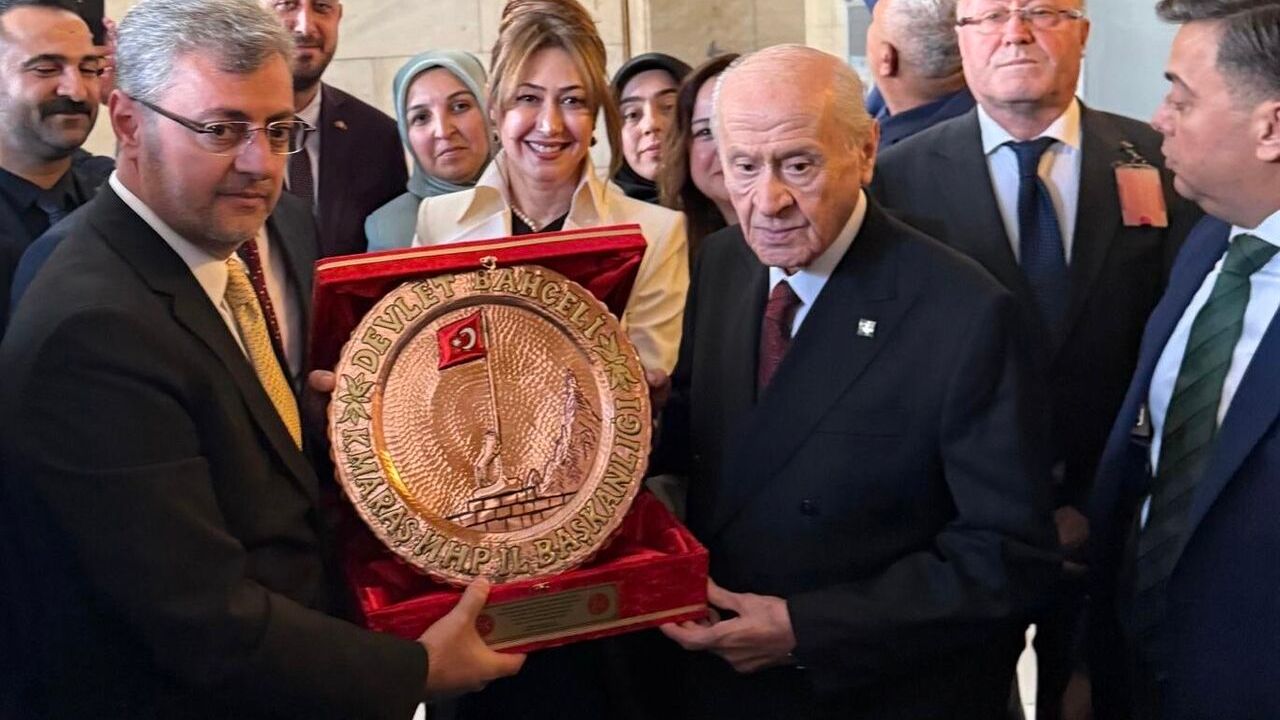 Ankara programı sadece Meclis ziyaretiyle sınırlı kalmadı. MHP Kahramanmaraş heyeti, Genel Merkez’e geçerek Teşkilatlardan Sorumlu Genel Başkan Yardımcısı Prof. Dr. Edip Semih Yalçın’ı makamında ziyaret etti. Bu ziyarette de özel bir hediye takdim edildi: Kahramanmaraş’ın kahramanlık simgesi İstiklal Madalyası, bakır üzerine işlenmiş şekilde sunuldu.