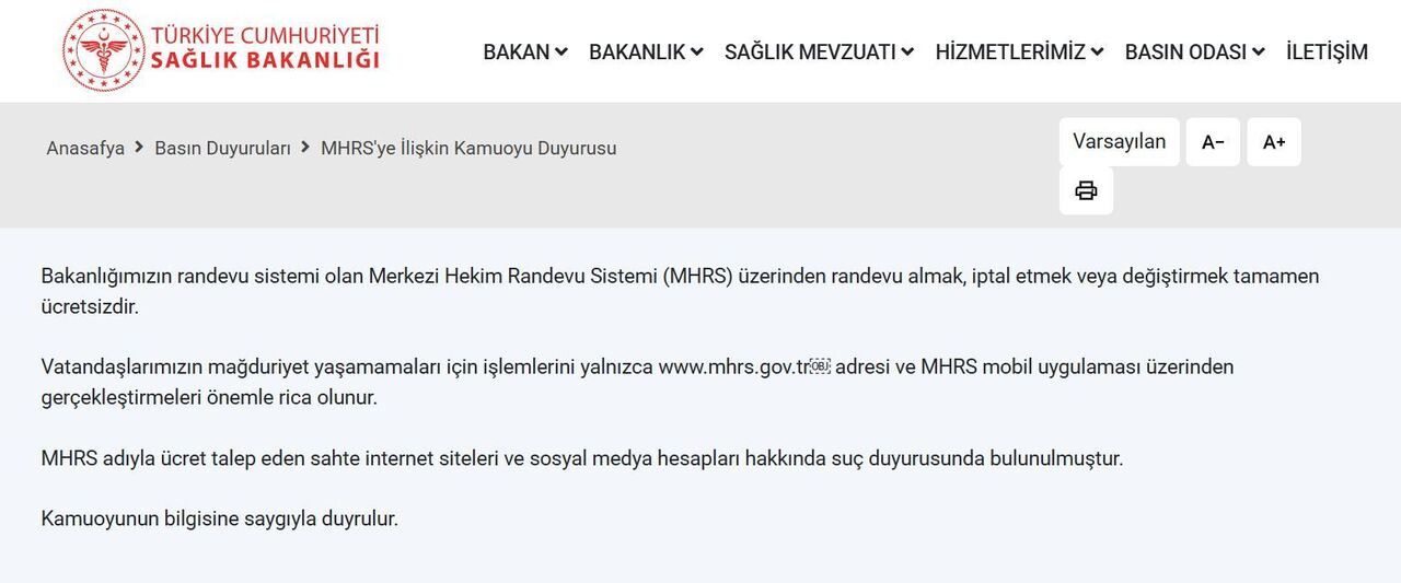 Bakanlık açıklamasında, MHRS üzerinden randevu almak, iptal etmek ya da değiştirmek gibi işlemlerin tamamen ücretsiz olduğunun altı çizildi. Son dönemde bazı sahte internet siteleri ve sosyal medya hesaplarının, MHRS adıyla işlem ücreti adı altında para talep ettiği, bu durumun vatandaşları mağdur ettiği ifade edildi. Bu tür girişimlere karşı dikkatli olunması ve dolandırıcılık faaliyetlerine itibar edilmemesi istendi.