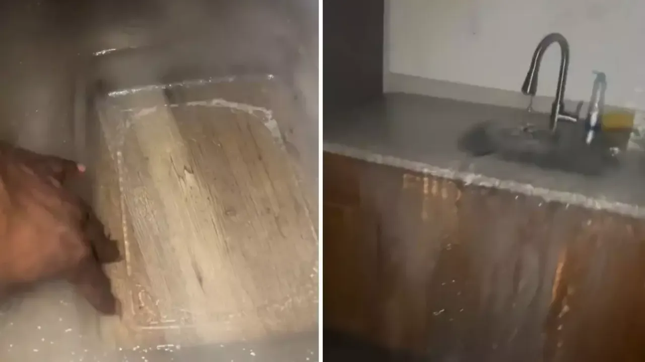 Yurt dışında yaşayan bir vatandaş, evde mutfak musluğunu açık unuttu. Saatlerce akan su, evin içinde birikerek ekstrem soğuk hava nedeniyle saniyeler içinde dondu ve tüm evi buzla kapladı.