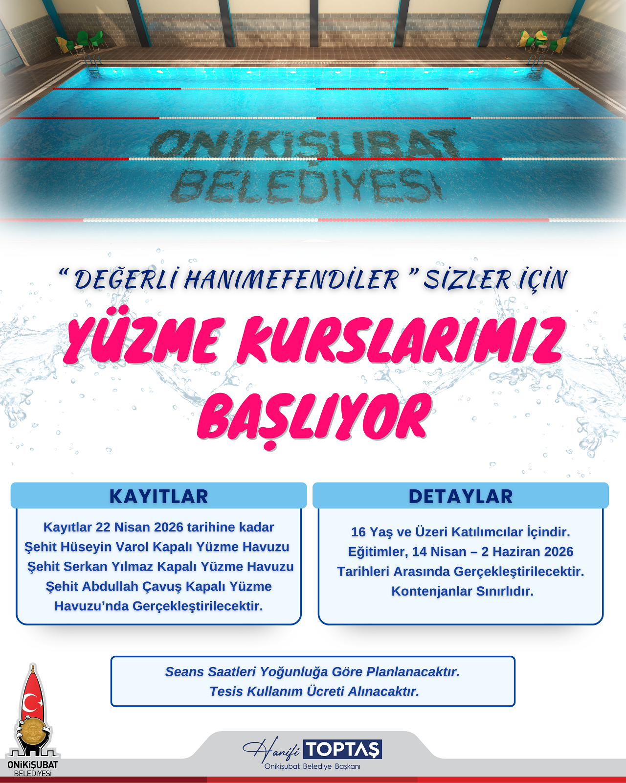 Onikişubat Belediyesi Kadınlara Özel Yüzme Kursu için ders zili Nisan ayında çalıyor. Belirlenen takvime göre eğitimler 14 Nisan 2026 tarihinde başlayacak ve 2 Haziran 2026 tarihine kadar devam edecek. Yaklaşık iki ay sürecek olan bu programda, seans saatleri başvuru yoğunluğuna göre optimize edilerek katılımcıların günlük programlarına en uygun şekilde düzenlenecek.