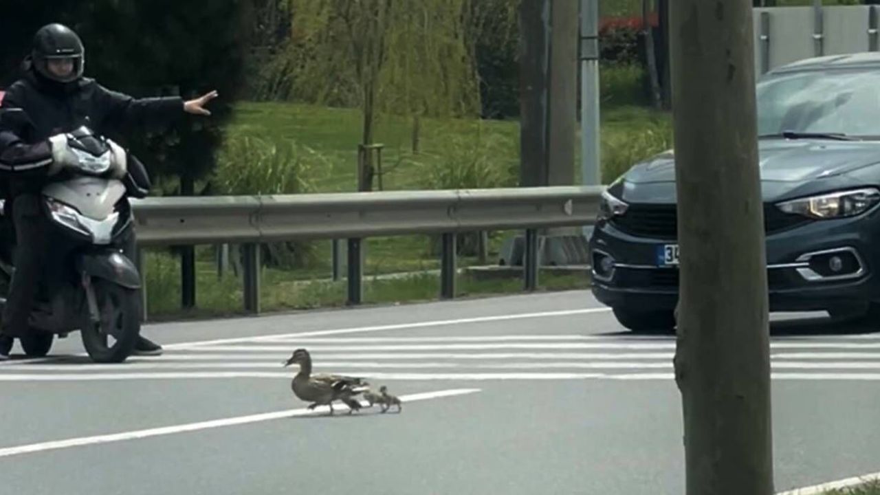 İstanbul Sancaktepe’de çekilen görüntülerde bir vatandaş, ördek ailesinin güvenli şekilde geçiş yapabilmesi için trafikte kısa süreli bir bekleyiş sağladı. Akan trafiği el hareketleriyle durduran sürücü, karşıya geçmekte zorlanan anne ördek ve yavrularına geçiş önceliği sağladı. Ördek ailesinin güvenli şekilde karşıya ulaşmasının ardından sürücü de onları takip ederek güvenli alana geçtiklerinden emin oldu.