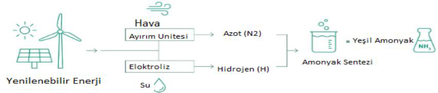 Türkiye Küresel ısınma ve iklim değişimi bağlamında 2053 yılına kadar net sıfır karbon emisyon hedefi koymuştur. Bu hedefe göre CO2 emisyonunu minimize edecek üretim metotlarının uygulamaya alınması gerekmektedir. Global NH3 üretiminin 290 Mt CO2 emisyonuna neden olduğu tahmin edilmekte ve global CO2 emisyonunun %1.5’den NH3 üretiminin sorumlu olduğu ifade edilmektedir (2). Günümüzde doğal gaz kullanılarak NH3 üretimi yerini yavaş yavaş yenilenebilir enerji (GES, RES) kullanılarak yeşil NH3 üretimine terk edeceği tahmin edilmektedir (Şekil 2).