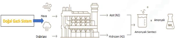 Tarımsal gübreler içerisinde en fazla kullanılan gübreler azotlu (N) gübrelerdir. Azotlu gübre üretiminde en temel işlemi amonyak (NH3) üretimidir. Günümüzde global NH3 talebinin % 77’si gübre sektöründen gelmektedir. Dünya NH3 talebi yıllık %1.7 artmaktadır. Dünya NH3 piyasası 100 milyar dolar civarındadır (1). Günümüzde NH3 üretimin yaklaşık %75’den fazlası doğal gaz kullanılarak elde edilmektedir. Az miktarda (%20-25) da diğer fosil yakıtlar da (kömür, petrol vb) kullanılmaktadır. Doğal gazın ana bileşeni metan (CH4)’dır. NH3 üretiminde hidrojen (H2) doğal gazdan, N ise havadan elde edilmekte ve Haber–Bosch metoduna göre sentezlenerek NH3 üretilmektedir (Şekil 1).